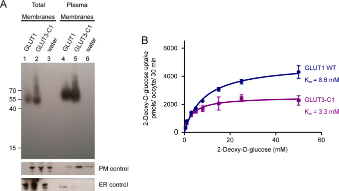 Figure S2. Expression of GLUT1 and GLUT3 chimera in Xenopus oocytes.(A) Western blot analysis between GLUT1-injected oocytes, GLUT3 chimera C1-injected oocytes, and water-injected oocytes, from total membrane and plasma membrane preparations. β-integrin is used as a plasma membrane loading control and calnexin as an ER control. (B) Michaelis–Menten analysis of 2-DG uptake between GLUT1 and GLUT3 chimera C1 in Xenopus oocytes. The data were fitted using the Michaelis–Menten non-linear fit, yielding a Km = 8.6 ± 0.8 mM and Vmax = 4,920 ± 155 pmol/oocyte/30 min for GLUT1 and Km = 3.3 ± 0.5 mM and Vmax = 2,537 ± 99 pmol/oocyte/30 min for GLUT3-C1. Data represent the mean ± SD of three or more replicate experiments.