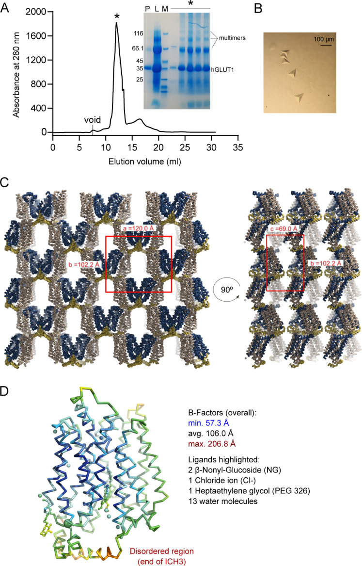 Figure S3. Purification and crystallization of human GLUT1.(A) Size exclusion profile of GLUT1 in 0.2% NG/0.02% CHS and the SDS–PAGE correspondent to the protein fraction was obtained (P: pool from Ni-NTA; L: SEC load; M: Size marker; *: Peak fractions). Crystal experiments were set up using the peak fractions (∼5 mg/ml concentration) directly. (B) GLUT1 crystals. (C) Asymmetric unit and crystal packing of GLUT1. The unit cell is highlighted in red. The asymmetric unit contains one molecule of GLUT1. (D) Backbone representation of GLUT1 and ligands are colored by atomic displacement factor (B-factor) with a rainbow gradient from low/blue (57.3 Å2) to high/red (206.8 Å2).