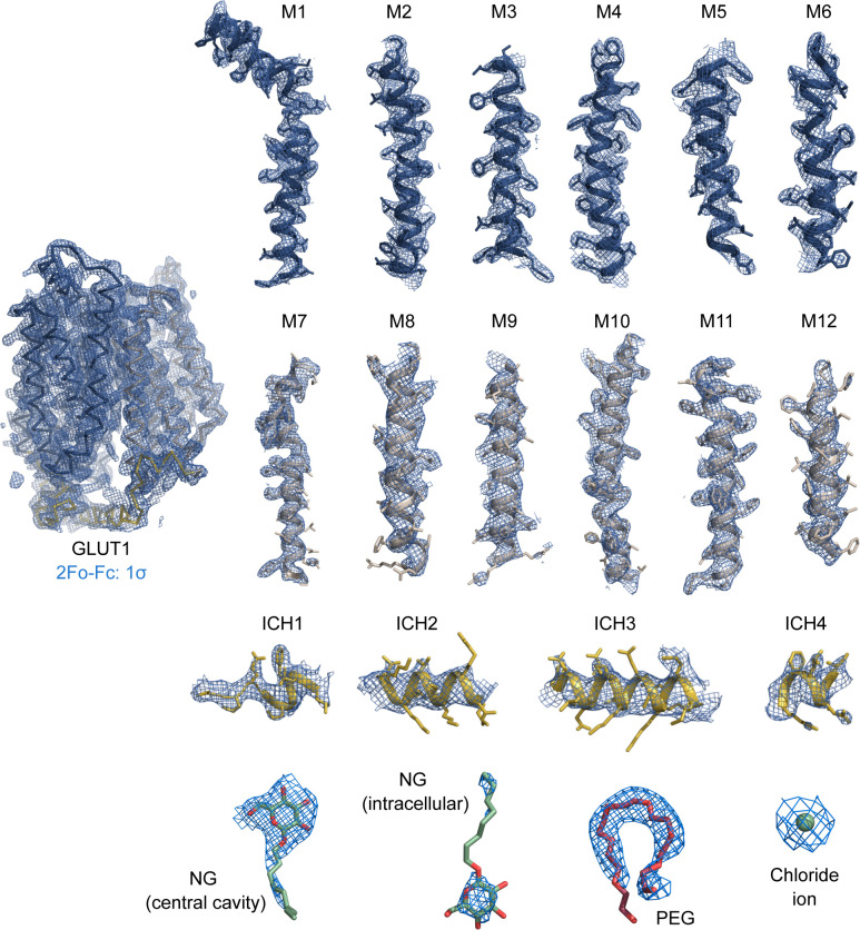 Figure S4. Electron density of the 2.4 Å crystal structure of GLUT1.Weighted 2Fo-Fc electron density map countered at 1.0 σ are colored in blue with the final model overlaid and amino acid side chains shown as sticks. Maps are shown for individual helices and ligands.