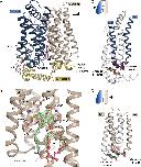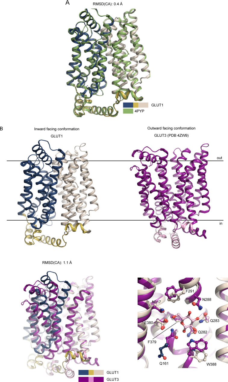Figure S5. Superposition between GLUTs.(A) Superposition between the GLUT1 (WT, this work, color coded as in Fig 2) and GLUT1 (N45T/E329Q, PDB 4PYP) show that the models are virtually identical along the backbone, despite the improved resolution. (B) Comparison between GLUT1 and GLUT3 structures. The human GLUT1 structure (this work) was solved in the inward-open conformation, whereas the GLUT3 structure (PDB 4ZW9) was solved in the outward-open conformation. Superimposition of GLUT1 and GLUT3, relative to their C domains show identical sugar coordination and highlight the movement of the N-domain. Residues are labeled according to GLUT1 sequence.
