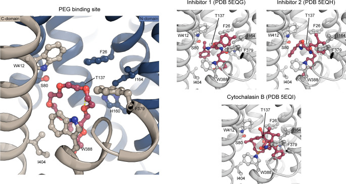 Figure S6. The PEG-binding site compared to binding of endofacial inhibitors.A PEG molecule (red) was identified just below the central binding-site of glucose. The PEG molecule binds through interactions with Trp388, Trp412, Ile404, Thr137, and Ser80. The PEG binding pose is similar to the pose of endofacial inhibitors 1 (PDB 5EQG) and 2 (PDB 5EQH) previously characterized for GLUT1, whereas the previously characterized cytochalasin B (PDB 5EQI) binding pose differs (despite being at the same binding site in the protein). The inhibitors are shown as sticks and colored in red, whereas protein is shown as cartoon and colored in gray. Investigation of the inhibitor density found in 5EQG and 5EQH, suggest the electron density could fit a PEG molecule as well. Interestingly, an older structure of GLUT1 (Deng et al, 2014) also has unmodeled density in this region that could accommodate a PEG molecule in the same site.