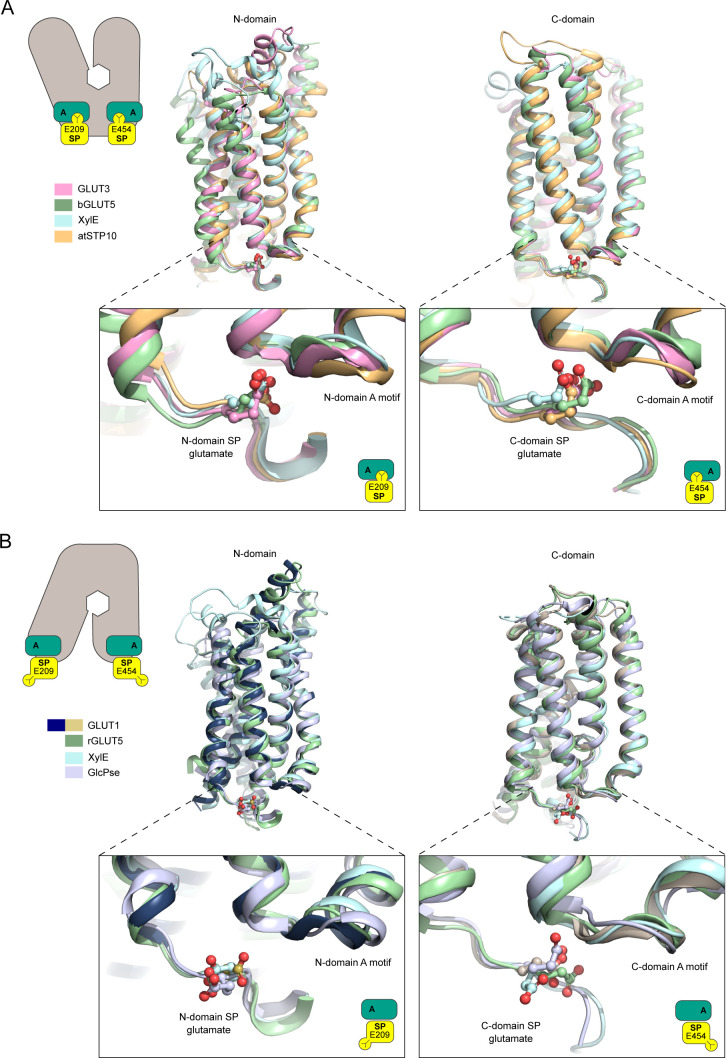 Figure S7. The Sugar Porter (SP) motif glutamate residue in known SP proteins structures.(A) Outward-open conformation structures of GLUT3 (PDB 4ZW9), rGLUT5 (PDB 4YBQ), and atSTP10 (PDB 6H7D) were superimposed relative to their N-domains (left) or C-domains (right). The glutamate residues (shown as sticks) in both N- (bottom left) and C- (bottom right) domains motifs are pointing towards the A-motif, interaction with it in an SP-A network. (B) Inward-open conformation structures from GLUT1 (this work), the GlcPse (PDB 4LDS), and bGLUT5 (PDB 4YB9) were superimposed relative to their N-domains (left) or C-domains (right). The glutamate residues (shown as sticks) in both N- (bottom left) and C-domains (bottom right) motifs point away from the A motif, with the exception of the C-domain glutamate of the GlcPse (bottom right).