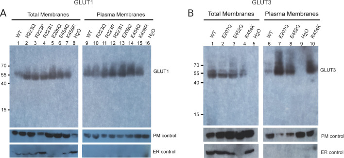 Figure S8. Expression of GLUT mutants in Xenopus oocytes.(A) Western blot analysis between GLUT1-injected oocytes, GLUT1 mutants and water-injected oocytes, from total membrane and plasma membrane preparations. β-integrin is used as a plasma membrane loading control and calnexin as an ER control. (B) Western blot analysis between GLUT3-injected oocytes, GLUT3 mutants, and water-injected oocytes, from total membrane and plasma membrane preparations. β-integrin is used as a plasma membrane loading control and calnexin as an ER control.