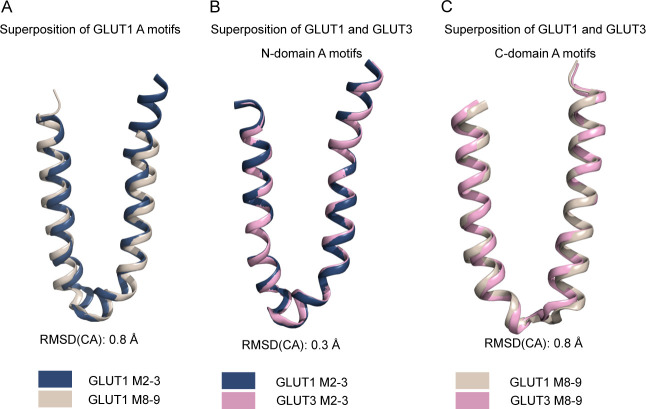 Figure S9. Conservation of the N-domain and C-domain A motifs.(A) Superposition of the GLUT1 N-domain A-motif (blue) with the C-domain A-motif (brown), shown as cartoon representation. (B) Superposition of the GLUT1 N-domain A-motif (blue) with the GLUT3 N-domain A-motif (pink), shown as cartoon representation. (C) Superposition of the GLUT1 C-domain A-motif (brown) with the GLUT3 C-domain A-motif (pink), shown as cartoon representation.