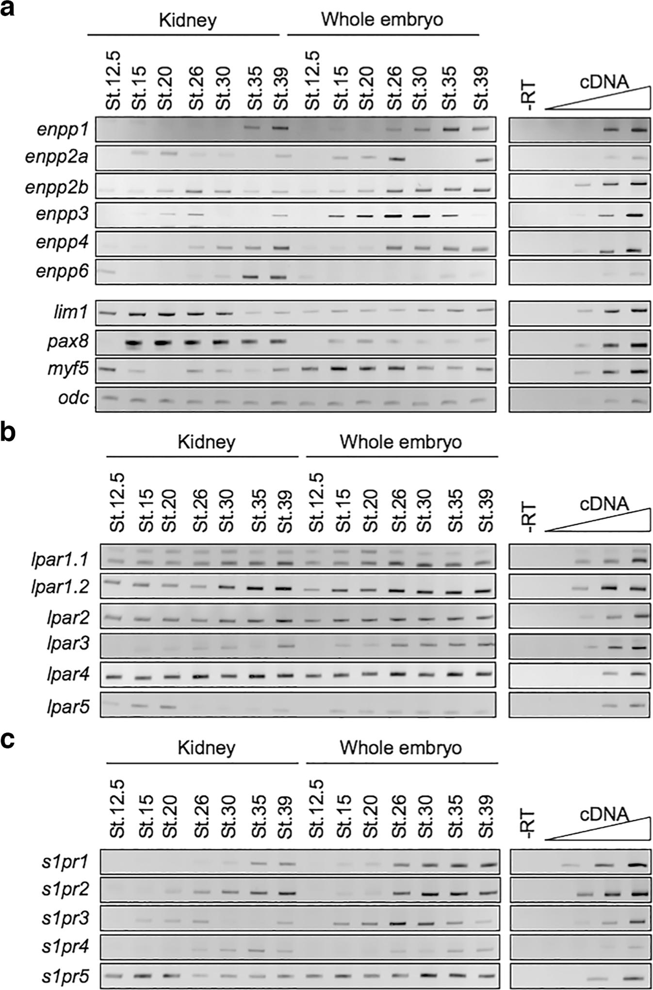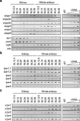 Fig. 3: The enpp and the lipidic receptors, the lpar and s1pr, gene family members are expressed in the pronephros. Developing pronephric anlagen or pronephric tubules were dissected as indicated, from whole X. laevis embryos and total RNA extracted. RT-PCR was performed on pronephric dissected tissues and control whole embryos along with negative and linearity controls. a Comparative expression pattern of the enpp genes and pronephric and muscle marker genes controlling the quality of the dissections. b Comparative expression profile of the lpa receptors. c Comparative expression profile of the s1pr genes. |