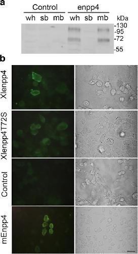 Fig. 5: Enpp4 is a transmembrane ectonucleotidase. a CHO cells were transfected with Xlenpp4-pcDNA3.1 or empty vector (control) and the cellular distribution of Enpp4 determined by western blotting using anti-XlEnpp4 antibody and proteins extracts from membrane (mb), soluble (sb) or whole cells (wh) fractions. b Representative images of the cellular distribution of Enpp4 determined by immunofluorescence using anti-XlEnpp4 or anti-mEnpp4 antibodies from CHO cells transfected with Xlenpp4-pcDNA3.1, Xlenpp4T72S-pcDNA3.1, mEnpp4-pcDNA3.1 or empty pcDNA3.1 vector (control). Corresponding brightfield images are also presented. Scale bar represents 20âµm. |