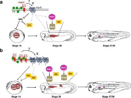 Fig. 8: Proposed model of how Enpp4/S1pr5 controls pronephros patterning. a During normal pronephric development, in the extracellular space, Enpp4 binds to phosphatidylserine close to, or in its catalytic site, which can then either interact with the S1pr5 or produce a novel ligand X, able to bind to this receptor. The activation of S1pr5 leads to the upregulation of lhx1/pax8 pronephric markers in the kidney field either by acting upstream of RA signalling pathway or by acting directly via the ERK or calcium pathways. At later stages, RA is required for tubules morphogenesis and Notch and Wnt pathway are involved in the patterning of the pronephric tubules. The mechanism by which S1pr5 activation directs the expression domains of these genes remains to be confirmed. b Enpp4 and S1pr5 overexpression lead to expanded and ectopic expression domains for both the Notch and RA pathway genes and wnt4. These changes in patterning gene expression domains induce the formation of enlarged pronephric segments and ectopic pronephric tubules. |