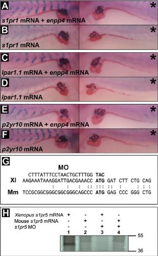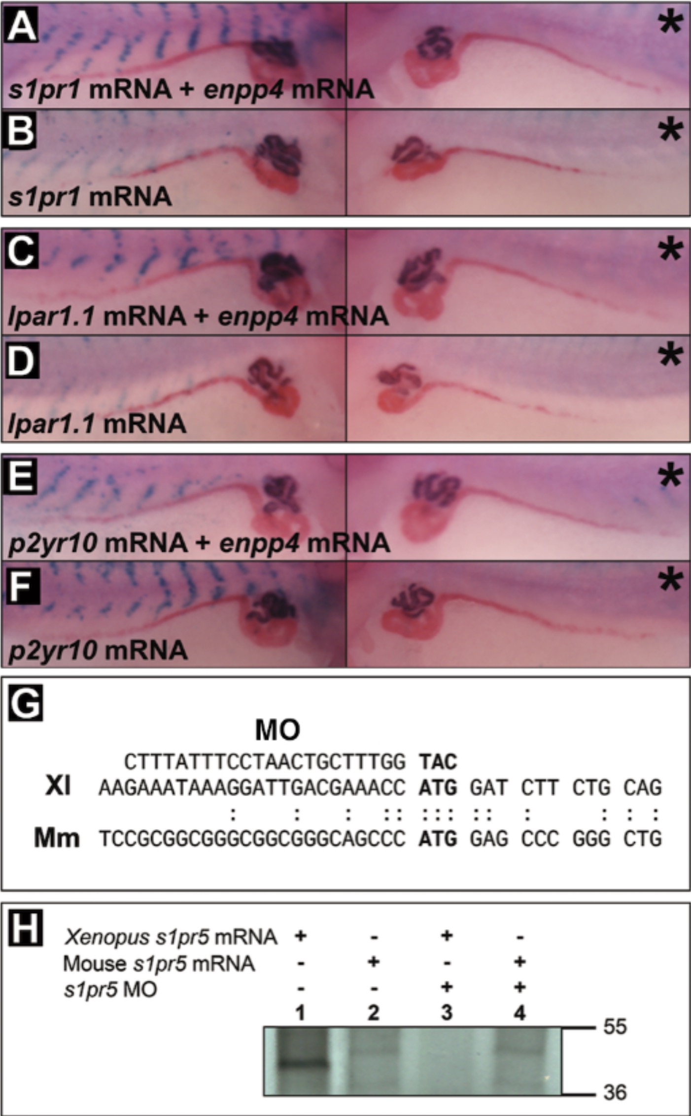Supplementary Fig. 6. Phenotypes caused by injection of s1pr1, lpar1.1 and p2yr10 mRNA and in vitro test of the s1pr5.L MO specificity (related to Fig. 6). (A-F) Microinjection of s1pr1, lpar1.1 and p2yr10 mRNA did not induce ectopic pronephros even when co-injected with enpp4 mRNA. Injected embryos were harvested at stage 40, and analyzed by 3G8/4A6 antibody staining. (A) Embryo injected with 2 ng of s1pr1 mRNA and 1ng of enpp4 mRNA or (B) 2ng of s1pr1 mRNA alone. (C) Embryo injected with 2ng of lpar1.1 mRNA and 1ng of enpp4 mRNA or (D) 2ng of lpar1.1 mRNA alone. (E) Embryo injected with 2ng of p2yr10 mRNA and 1ng of enpp4 mRNA or (F) with 2ng of p2yr10 mRNA alone. Asterisk denotes uninjected sides. The raw data and statistical analyses are provided in Supplementary Table 5. (G-H) s1pr5.L MO specifically inhibited Xenopus s1pr5.L mRNA translation. (G) Alignment of the 5âUTR of Xenopus (Xl) and mouse (Mm) s1pr5 sequences and position of s1pr5.L MO in relation to Xenopus s1pr5.L cDNA. The ATG is indicated in bold and identical nucleotides (nt) by dots. This alignment shows that only 8 nt of s1pr5.L MO sequence are conserved between the two species. (H) Xenopus s1pr5.L but not mouse S1pr5 translation was blocked by s1pr5.L MO; autoradiograph of a 10% SDS-PAGE gel of in vitro translated 35S-Methionine radiolabeled s1pr5 proteins. Capped synthetic s1pr5 RNAs was translated in vitro in the Rabbit Reticulocyte Lysate System (Promega) according to manufacturerâs protocol. Lane 1, Translation of Xenopus s1pr5.L mRNA (1μg) produced a protein of 43 kDa. Lane 2, Translation of mouse S1pr5 mRNA (1 μg) produced a protein of 42 kDa. Lane 3, Translation of Xenopus s1pr5.L mRNA was severely affected by the addition of 10 μg of s1pr5.L MO. Lane 4, Translation of mouse S1pr5 was unaffected by s1pr5.L MO. Mm: Mus musculus; Xl: Xenopus laevis. |