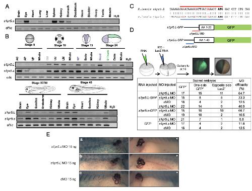 Supplementary Fig. 7. Expression profile of the sp1r5.S receptor gene, in vivo test of MO specificity and phenotypes caused by its knock-down (related to Fig. 6). (A) The s1pr5.S receptor displays a restricted expression profile in the adult frog and is expressed in the mesonephric tissue. Adult tissues were dissected and total RNAs from adult tissues were extracted using Trizol (Invitrogen) following the manufacturerâs protocol. RT- PCR was performed along with negative control. (B) The novel s1pr5.S receptor is expressed in the kidney with an expression profile similar to its homelog, the s1pr5.L receptor. X.laevis embryos were dissected and total RNA extracted. RT-PCR was performed on dissected tissues and control whole embryos along with negative control. S1pr5.S was amplified using the following primers (forward primer, 5â- ggaggtctcgttgctgtctc -3â and the reverse primer, 5â- cggtagctcctcgtgtaacc -3â) with the annealing temperature of 53°C and 32 cycles, Each RT-PCR product was sequenced to confirm the specificity of the amplifications. (C) Alignment of the 5âUTR of X.laevis s1pr5 homeologs sequences and position of s1pr5.L and s1pr5.S MOs. The ATG is indicated in red and identical nucleotides by dots. Only 4 nucleotides over the whole MOs sequences differ between the two genes. (D) Efficacy of the s1pr5.L and s1pr5.L MOs. Schematic representation of the GFP fusion proteins containing the 5âUTR and part of the coding region of s1pr5.L and s1pr5.S. The position of the s1pr5.L and s1pr5.s MO are indicated. Xenopus embryos were injected with the s1pr5.LGFP, s1pr5.S -GFP and GFP mRNAs at one cell stage followed by unilateral injections of s1pr5.L, s1pr5.S and control MOs in presence of LacZ mRNA at 2-cell stage. GFP+ positive embryos were sorted at stage 16 and stained for Ã-galactosidase activity. The numbers of embryos GFP+ fluorescent on one side and LacZ+ on the opposite side and the percentage of efficiency of the different MOs to inhibit in vivo the translation of the different mRNAs are indicated in the table. (E) Microinjection of s1pr5.S MO induces a similar kidney phenotype than the microinjection of the s1pr5.L MO. Injected embryos analysed by 3G8/4A6 antibody staining at stage 41. (a) Embryo injected with 15ng of s1pr5.S MO (b) Embryo injected with 15ng of s1pr5.L MO. (c) Embryo injected with 15ng of control MO. Asterisk denotes uninjected sides. The raw data and statistical analyses are provided in Supplementary Table 5. |