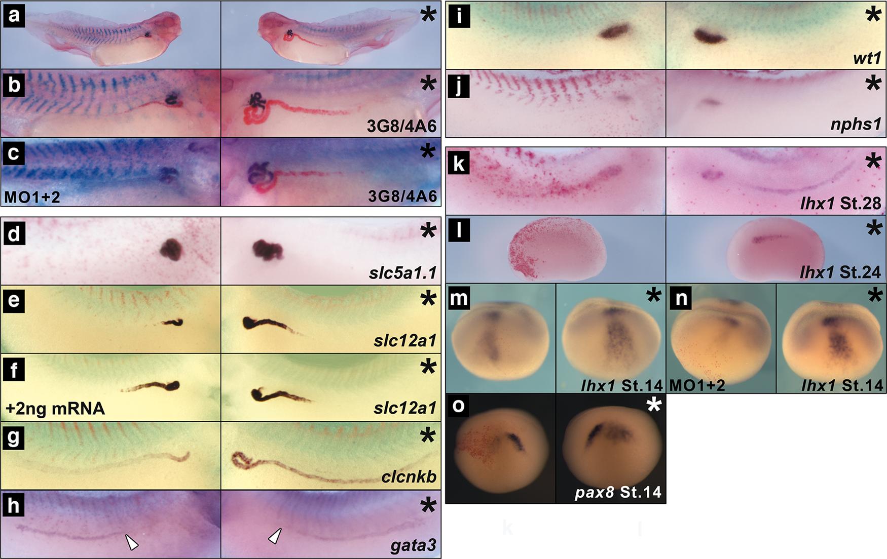 Fig. 2: MO knock-down of enpp4 expression disrupts pronephros formation. Embryos targeted with 10âng of enpp4 MO1 or 10âng of both enpp4 MOs (c, n) and 250âpg of lacZ mRNA were examined by 3G8/4A6 antibody staining (aâc) or whole-mount in situ hybridization with the following probes: slc5a1.1 (d), slc12a1 (e, f), clcnkb (g) and gata3 (h) at stage 37/38; wt1 (i) and nphs1 (j) at stage 33/34, lhx1 (kân) at stages 28, 24 and 14, pax8 (o) at stage 14. The embryo shown in (f) was co-injected with 2âng of mouse Enpp4 mRNA to rescue enpp4 knock-down phenotype. The asterisk denotes the control, uninjected side of each embryo. Blank arrowheads in (h) indicate the anterior limit of gata3 expression. See also Supplementary Table 2 for raw data and statistical analyses and Supplementary Figs. 2 and 3. |