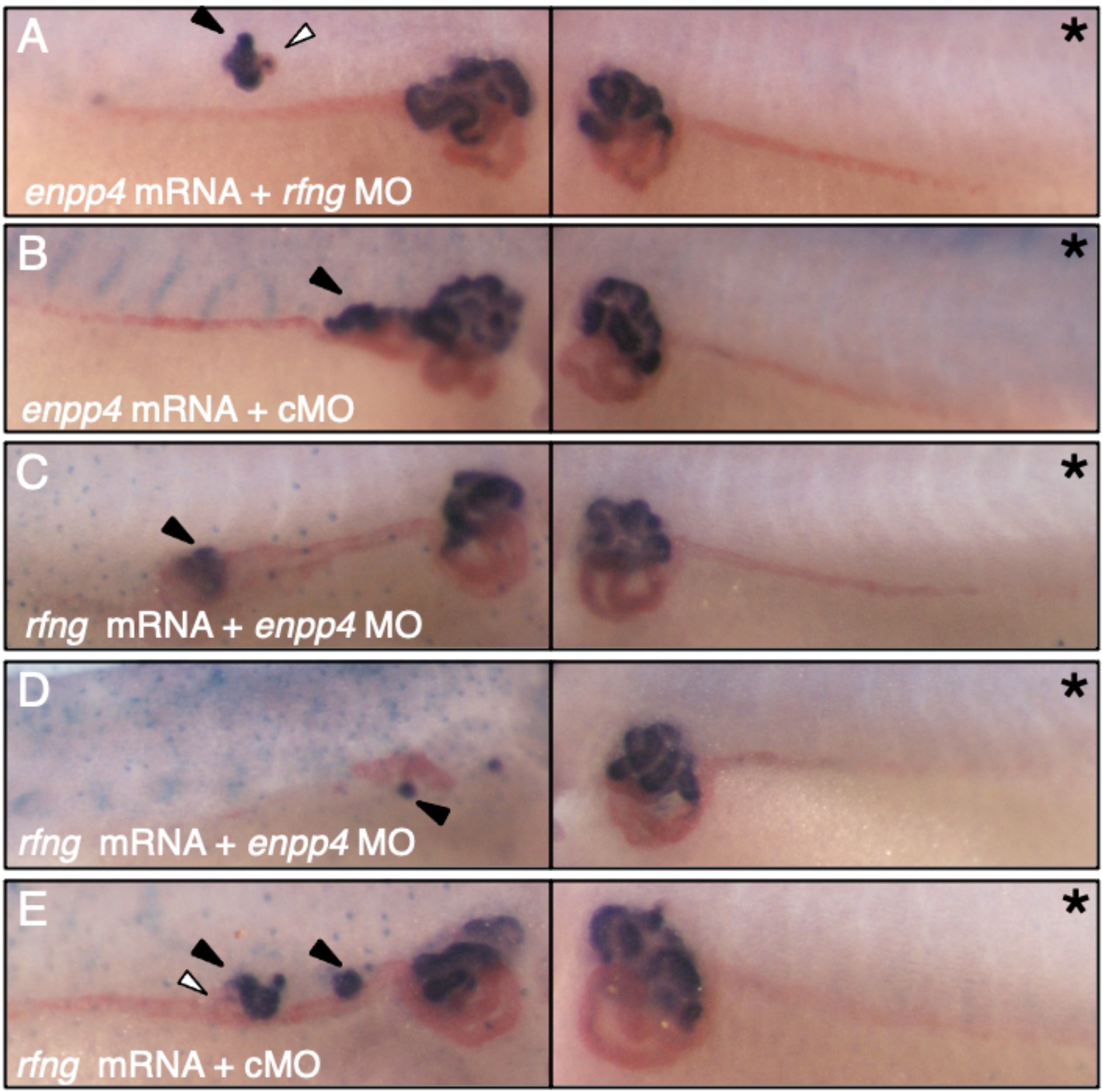 Supplementary Fig. 5. Phenotypes caused by co-injection of enpp4 or rfng mRNA and MO (related to Fig. 4). Injection of rfng MO did not prevent ectopic pronephros formation caused by enpp4 over-expression whereas co-injection of enpp4 MO and rfng mRNA altered ectopic and endogenous pronephros formation. Injected embryos were harvested at stage 40, and analysed by 3G8/4A6 antibody staining. (A) Embryo injected with 2 ng of enpp4 mRNA and 20 ng of rfng MO. (B) Embryo injected with 2 ng of enpp4 mRNA and 20 ng of control MO. (C, D) Embryo injected with 2 ng of rfng mRNA and 10 ng of enpp4 MO2. (E) Embryo injected 2 ng of rfng mRNA and 10 ng of control MO. Asterisk denotes uninjected sides. Black arrowheads indicate 3G8 ectopic staining and white arrowheads 4A6 ectopic staining. The raw data and statistical analyses are provided in Supplementary Table 3. |