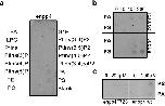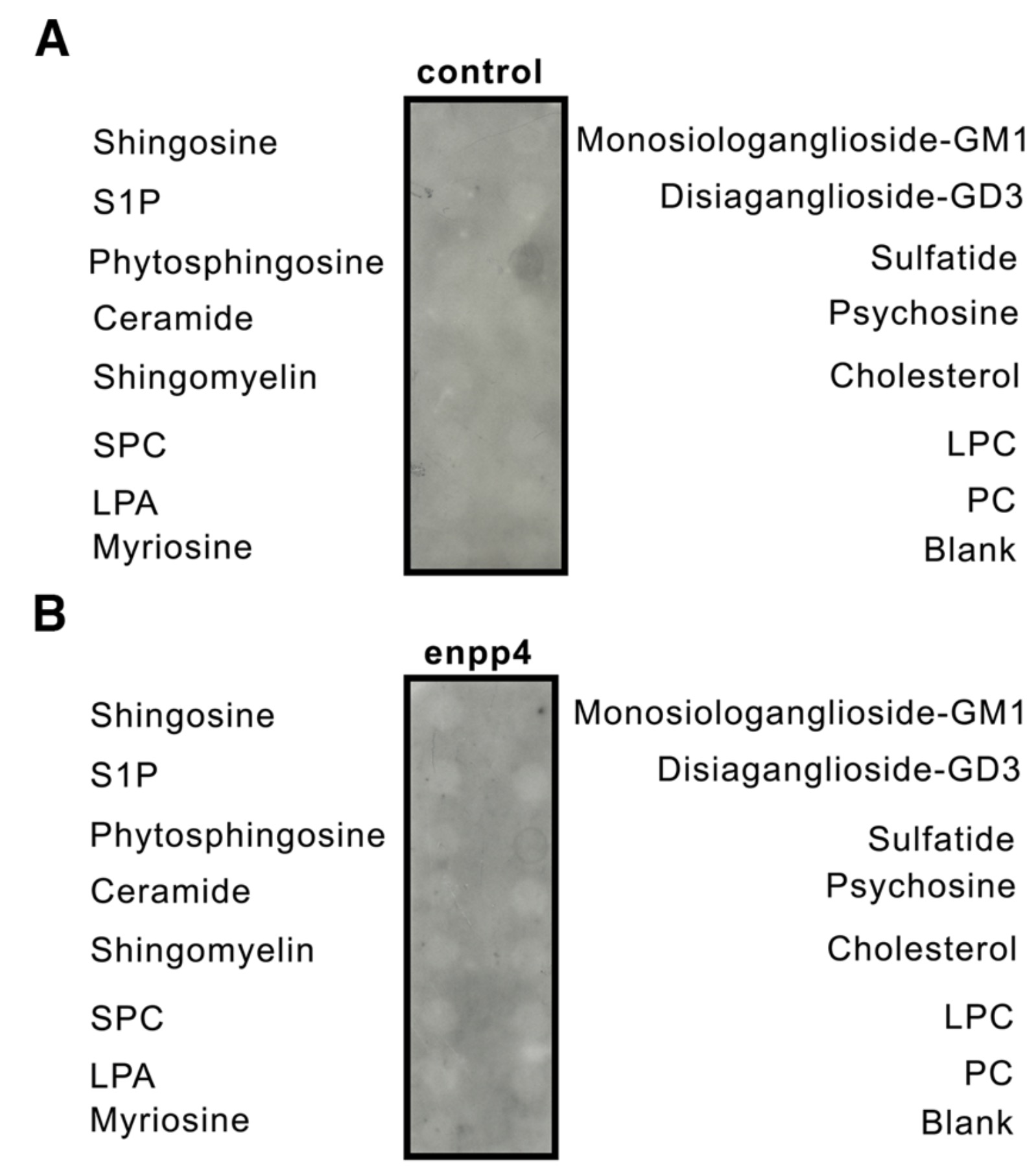 Supplementary Fig. 8. Enpp4 does not interact with bioactive lipids metabolized by enpp2, enpp6 and enpp7 (related to Fig. 7). ShingoStripsTM was incubated with membrane protein extracts from (A) control pcDNA3.1 transfected CHO cells or (B) from enpp4 over-expressing CHO cells and the bound enpp4 protein detected with anti-Xlenpp4 serum. LP A, lysophosphatidic acid; LPC, lysophosphocholine; PC, phospatidylcholine; S1P , shingosine-1-phosphate; SPC, Shingosylphosphorylcholine. |
