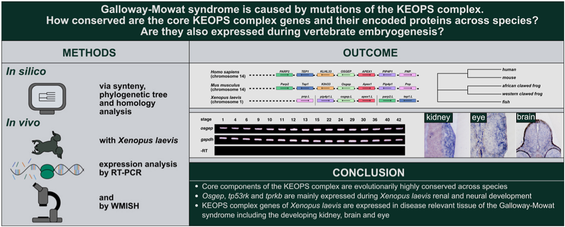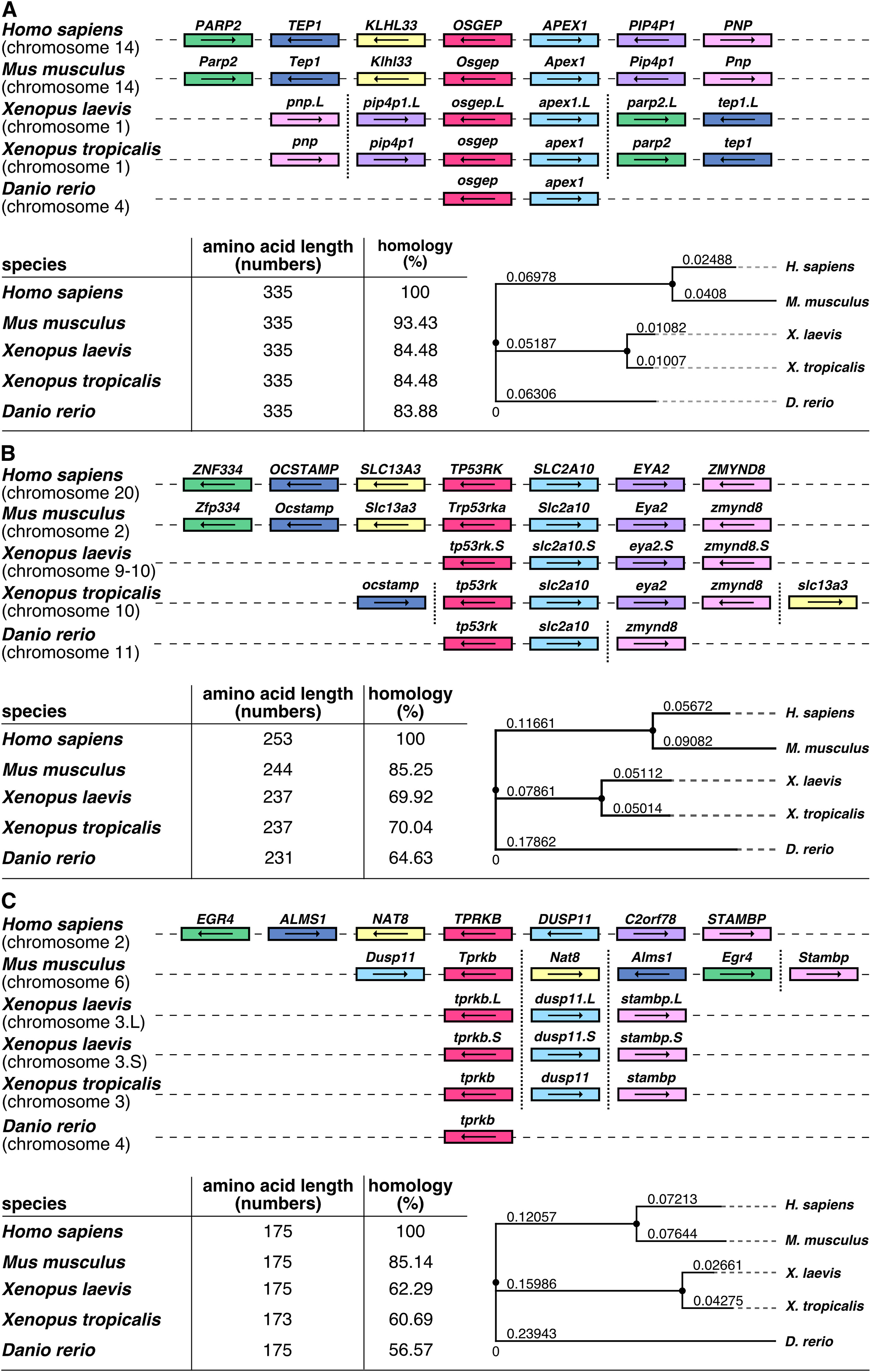 Fig. 1. In silico analysis of osgep (A), tp53rk (B), and tprkb (C) revealed high conservation across species. Synteny analysis of osgep (A, upper part), tp53rk (B, upper part) and tprkb (C, upper part) and its neighboring genes in Homo sapiens, Mus musculus, Xenopus laevis, Xenopus tropicalis and Danio rerio. Schematic overview of the genes' location and its surrounded genes among different species. Conserved genes are depicted by boxes with identical colors, osgep (A), tp53rk (B) and tprkb (C) are shown in red. Non-conserved neighboring genes are not shown. The orientations of the open reading frames are indicated by arrows. Gene lengths as well as the distances are not proportional to their actual size. More distanced genes on the same chromosome are emphasized by a vertical dashed line. Chromosomal location is listed below the species name. Xenopus laevis S or L chromosome is specified next to the gene name. Osgep, o-sialoglycoprotein endopeptidase; parp2, poly (ADP-ribose) polymerase 2; tep1, telomerase associated protein 1; klhl33, kelch like family member 33; apex1, apurinic/apyrimidinic endodeoxyribonuclease 1; pip4p1, phosphatidylinositol 4,5-bisphosphate 4-phosphatase 1; pnp, purine nucleoside phosphorylase. tp53rk, TP53 regulating kinase; znf334, zinc finger protein 334; ocstamp, osteoclast stimulatory transmembrane protein; slc13a3, solute carrier family 13 member 3; slc2a10, solute carrier family 2 member 10; eya2, EYA transcriptional coactivator and phosphatase 2; zmynd8, zinc finger MYND-type containing 8. tprkb, TP53RK binding protein; egr4, early growth response 4; alms1, ALMS1 centrosome and basal body associated protein; nat8, N-acetyltransferase 8 (putative); dusp11, dual specificity phosphatase 11; c2orf78, chromosome 2 open reading frame 78; stambp, STAM binding protein. Homology of the amino acid sequences of full-length Osgep (A, lower left part), Tp53rk (B, lower left part) and Tprkb (C, lower left part) among different species. Amino acid length is given in numbers. Percentages represent identical residues (percent identity) of the indicated species compared to Homo sapiens. Phylogenetic trees (Phylogram) of Osgep (A, lower right part), Tp53rk (B, lower right part) and Tprkb (C, lower right part) on the basis of its alignment across indicated species show an evolutionary relationship between human, mouse, frog and fish. Genetic distances between the nodes of the phylogenetic tree were indicated by numbers above the branching lines which were generated by Clustal Omega and iTOL.
