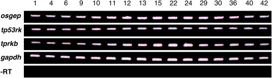 Fig. 2. Osgep, tp53rk and tprkb are temporally expressed during Xenopus embryogenesis. Temporal expression pattern of osgep, tp53rk and tprkb during Xenopus laevis embryogenesis analyzed by semi-quantitative reverse transcriptase (RT)-PCR with Xenopus cDNA templates of the indicated stages. All three genes were detected in all investigated stages. Glyceraldehyde 3-phosphate dehydrogenase (gapdh) was used as loading control, and as negative control -RT which reaction lacks reverse transcriptase.
