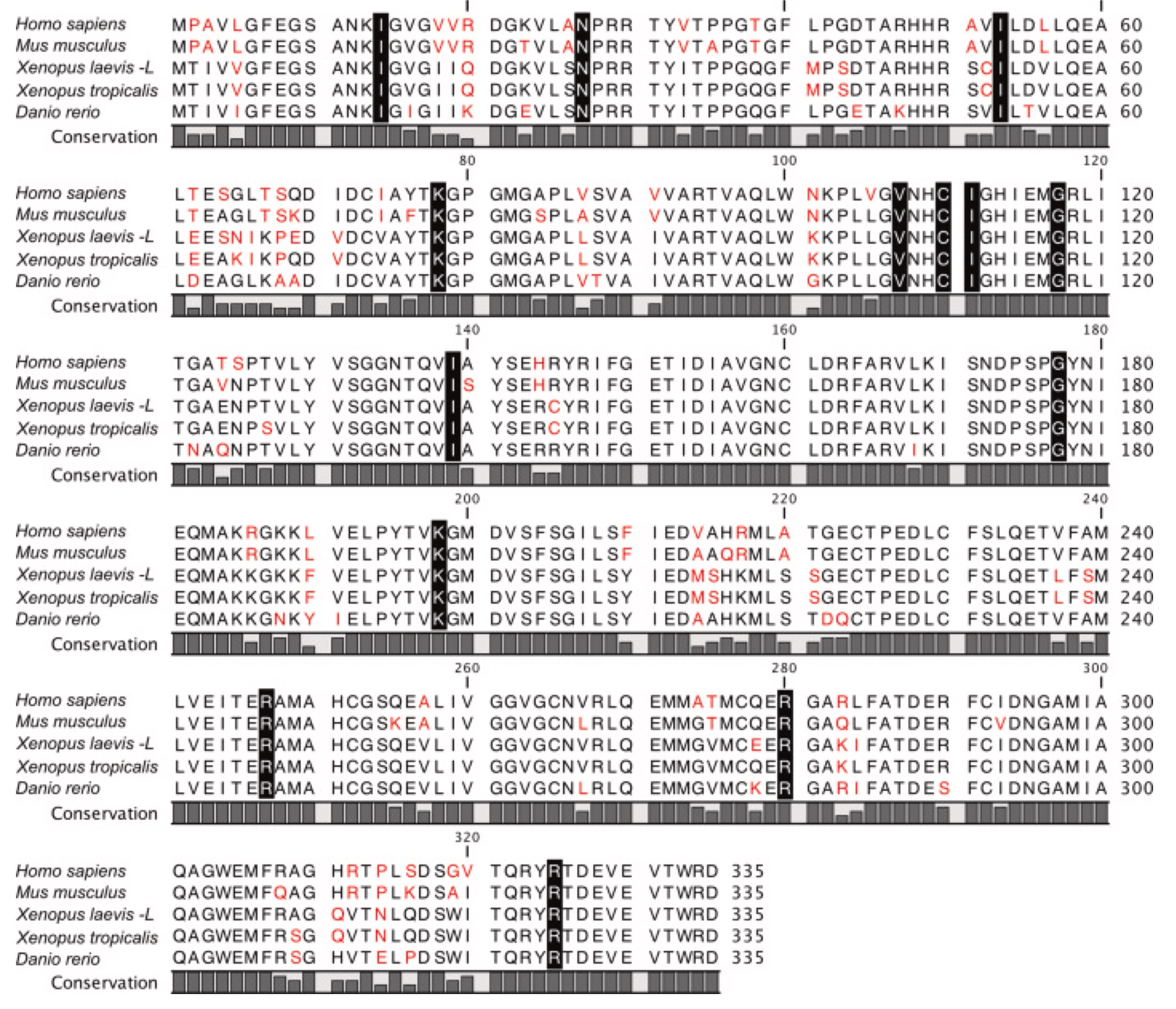 Supplemental Figure 1. Multiple sequence alignment from Osgep shows high amino acid conservation, especially at the patients’ mutation amino acids (black shadowed). Multiple sequence alignment illustrated by QIAGEN CLC Genomics Workbench. Varied amino acids are shown in red and conserved amino acids in black. The known patients’ mutations amino acids are black shadowed.