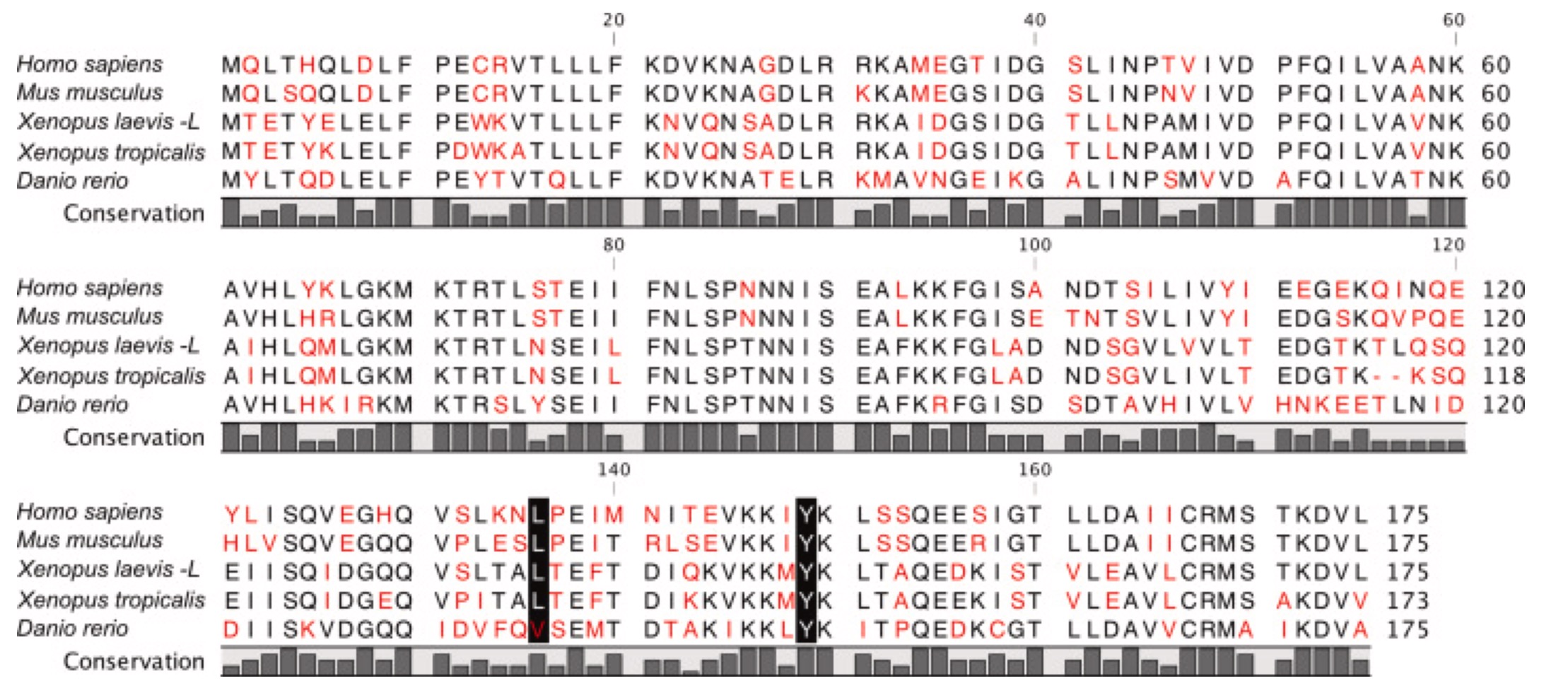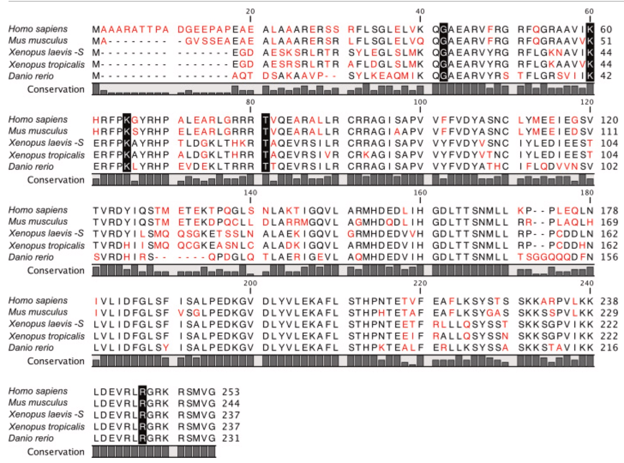 Supplemental Figure 2. Multiple sequence alignment from Tp53rk shows high amino acid conservation, especially at the patients’ mutation amino acids (black shadowed). Multiple sequence alignment illustrated by QIAGEN CLC Genomics Workbench. Varied amino acids are shown in red and conserved amino acids in black. The known patients’ mutations amino acids are black shadowed.