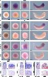 Fig. 3. Osgep expression during Xenopus development. Spatio-temporal expression pattern of osgep visualized by whole mount in situ hybridization (WMISH). Embryonic stages and scale bars are indicated in each panel. Upper part: WMISH with exterior view. Scale bars are equivalent to 500 μm. Black dashed lines represent section planes. Lower part: WMISH following sections. Scale bars are equivalent to 100 μm. (A) Animal view, (B) lateral view and (C) vegetal view of Xenopus embryos in very early stages showed an osgep expression in the animal pole (arrowhead) and in the developing neural plate (arrow) beside the blastopore (bp). During Xenopus embryogenesis osgep is strongly expressed in neural tissue which is revealed by dorsal view (D, G) in the dorsal neural tissue and neural tube (nt) and by anterior view (E, F) in the anterior neural plate (anp), neural tube (nt) and the developing eye, more precisely in the eye vesicle (ev). (H, I, J, K) Lateral view, osgep expression is detected in the somites (s), the eye vesicle (ev) or eye (e), the embryonic kidney (pronephric anlage (pa), pronephros (p)), the otic vesicle (ov), the brain (b) and the mandibular (ma), hyoid (ha) and branchial arch (ba) which will develop into the cranial cartilage. (L) Parasagittal view showed an expression of osgep in the neuroectoderm (ne). The transversal view (M, P) revealed osgep transcripts in the mesencephalon (m), neural crest cells (ncc), eye vesicle (ev). Horizontal sections (N, O, Q, R) showed an expression in the somites (s), spinal cord (sc), the mandibular (ma), hyoid (ha) and branchial arches (ba), embryonic kidney (pronephric tubule (pt)) as well as in the eye, more detailed in the lens (le) and ciliary marginal zone (cmz).