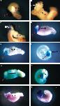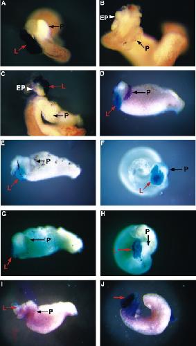 Figure 4. Liver Gene Expression in Transgenic Gut Preparations(AâC) Transthyretin (TTR) RNA expression. (A) In wild-type preparations, expression is only seen within the liver. (B and C) TTR-Xlhbox8-VP16 transgenics. (B) In this case, there is complete conversion of liver to pancreas, and transthyretin expression has been completely suppressed. (C) In this case, half the liver has changed into pancreas, and transthyretin expression is seen only in the other half. In all examples, nontransgenic guts were stained simultaneously with transgenic guts, and the staining reaction was stopped in both when the nontransgenic expression was clearly evident.(D) Liver differentiation begins normally in TTR-Xlhbox8-VP16 tadpoles. Xhex (blue) and GFP (magenta, driven by the elastase promoter) expression. GFP RNA is seen only in the dorsal and ventralpancreas at stage 40; no GFP expression is detected in the liver. Xhex expression is normal at this stage and is present throughout the whole liver.(EâH) Timing of liver differentiation in normal nontransgenic tadpoles: from 3 days, the liver has become a separate organ, with Xhex and AMBP expressed throughout. (E) Xhex RNA at stage 40 (3 days). (F) Xhex RNA at stage 45 (5 days). (G) AMBP RNA at stage 40 (3 days). (H) AMBP expression at stage 45 (5 days).(I and J) The TTR promoter becomes active in Xenopus tadpoles only after the liver has differentiated. This shows RNA in situ hybridization for GFP driven by the TTR promoter. (I) At stage 40 (3 days), no GFP expression is detected. (J) GFP expression is first detected at stage 44 (4 days).