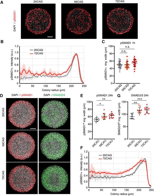 cCAG expansion leads to enhanced late pSMAD1 and SMAD2/3 response. (A) Short-term BMP4 response (5â ng/ml) of 20CAG (left), 56CAG (middle) and 72CAG (right) in conditioned medium. Samples were fixed after 1â h of stimulation and immunostained for pSMAD1 (red); nuclei are visualized with DAPI (gray). (B) Mean radial pSMAD1 profile analyzed for the early response based on immunofluorescence data. Data are mean±s.d. of n>20 colonies/genotype. (C) Quantification of pSMAD1 activation from colony edge. The width of pSMAD1+ ring is determined based on radial intensity profile in early BMP4 signaling. Each data point corresponds to a single colony. Data are mean±s.d. of n>20 colonies/genotype. n.s. P>0.05, KruskalâWallis followed by Dunn's test. (D) Immunofluorescence data demonstrating activation of both TGFβ signaling branches after 24â h of BMP4 treatment (50â ng/ml) probed against the effectors pSMAD1 (red) and SMAD2/3 (green) in 20CAG (top), 56CAG (middle) and 72CAG (bottom). DNA is stained with DAPI (gray). (E) pSMAD1+ ring width in expanded CAG-length cell lines (56CAG and 72CAG) compared with 20CAG in late BMP4 signaling. Values are calculated from the radial intensity profile of individual colonies. Scatter plot of n=10 colonies/genotype. Data are mean±s.d. *P<0.05, **P<0.01, KruskalâWallis followed by Dunn's test. (F) Radial profiling of pSMAD1 intensity at 24â h. Data are mean±s.d. n>10 colonies/genotype. (G) 56CAG and 72CAG exhibit expanded nuclear SMAD2/3+ ring width compared with 20CAG. Width values of n=10 colonies/genotype. Data are mean±s.d. **P<0.01, ***P<0.001, KruskalâWallis followed by Dunn's test. Individual colonies originate from a single micropatterned chip for each clone. Similar results were obtained from n=3 independent experiments. Scale bars: 100â µm. |