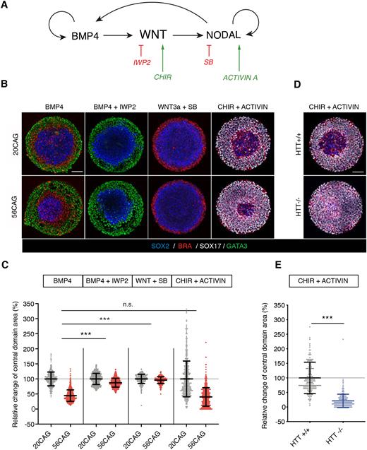 Fig. 3. Unraveling the effect of HTT-CAG expansion on the signaling events governing 2D gastruloid patterning. (A) Schematic illustration of signaling hierarchy driving 2D gastruloid differentiation. BMP4 induces WNT, which in turn stimulates NODAL. Through a positive-feedback mechanism, BMP4 and NODAL also induce themselves. IWP2 is a pharmacological inhibitor of WNT secretion downstream of BMP4. CHIR 99021 is a chemical compound stimulating canonical WNT signaling cell-intrinsically. SB431542 selectively inhibits the activin/NODAL branch of TGFβ signaling. Activin acts through the same receptors and activates the same effectors as NODAL. (B) Dissection of 2D gastruloid signaling in 20CAG (top) and 56CAG (bottom). Three germ layers induced by BMP4 (50â ng/ml). IWP2 (2â µM) in combination with BMP4 (50â ng/ml) leads to abolished mesendoderm differentiation. In the absence of activin/NODAL signaling [blocked by SB431542 (10â µM)], WNT3a (100â ng/ml) induces mesoderm from the periphery. Activin (100â ng/ml) in combination with CHIR 99021 (6â µM) promotes endoderm differentiation in a radially symmetrical manner. Immunostaining was performed against SOX2 (blue), BRA (red), GATA3 (green) and SOX17 (gray) after 48â h of differentiation in conditioned medium. (C) The size of the central domain is determined as a relative change to the mean central domain area of 20CAG colonies as a percentage. Scatter plot represents normalized data points of n>250 colonies obtained from n=2 or 3 independent clones/genotype. Data are mean±s.d. in all respective conditions. Relative differences between the genotypes were statistically compared between each condition. n.s. P>0.05, ***P<0.001, ANOVA. (D) Fate acquisition in HTTâ/â compared with HTT+/+ in CHIR 99021 and activin-induced micropatterns probed by immunofluorescence against SOX2 (blue), BRA (red) and SOX17 (gray). (E) Quantification of the percentage change in central domain area relative to the mean central domain area of HTT+/+. Scatter plot represents normalized data points from nâ¥200 colonies/genotype. Data are mean±s.d. ***P<0.001, MannâWhitney. Individual colonies were obtained from a single micropattern chip for each clone. Similar results were obtained from n=3 independent experiments in each condition. Scale bars: 100â µm. |
