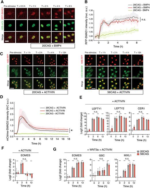 Fig. 4. HTT-CAG expansion selectively affects cell-autonomous SMAD2 signaling dynamics without altering transcriptional output. (A) BMP4 (5â ng/ml) response of RFP-SMAD1 reporter single hESCs obtained from live imaging data in 20CAG pre and 0.5, 1, 2, 4 and 8â h post-ligand presentation in TeSR-E7 medium lacking TGFβ ligands. (B) Quantification of nuclear RFP-SMAD1 signal intensity in 20CAG, 56CAG and untreated 20CAG control single cells over time. Mean intensity values±s.d. are plotted for n>200 cells at each time-point in both genotypes. Cells were induced with BMP4 at T=0â h and imaged every 10â min. Similar results were obtained from n=2 independent experiments. n.s., P>0.05, unpaired t-test. (C) Response to activin (1â ng/ml) of 20CAG (left) and 56CAG (right) mCitrine-SMAD2 reporter single hESCs in defined TeSR-E7 medium. Snapshots from live imaging shown prior to and 1, 2, 4 and 12â h following stimulation. (D) Quantitative analysis of nuclear-to-cytoplasmic ratio (N:C) of mCitrine-SMAD2 intensities in single cells as a function of time. Data are mean signal intensities±s.d. of n>200 cells at each time-point are shown. Activin was added at T=0â h and images were acquired every 10â min in n=3 independent experiments. *P=0.0164, unpaired t-test. (E) Time-course RT-qPCR analysis of key pluripotency associated genes induced by SMAD2 upon activin (10â ng/ml) stimulation in both 20CAG (gray) and 56CAG (red) genotypes. (F) Expression of the SMAD2 target mesendoderm differentiation gene EOMES for 12â h following activin treatment. (G) SMAD2 target mesendoderm differentiation genes induced for over 12â h when stimulated with activin in combination with WNT3a (100â ng/ml). RT-qPCR analyses were performed in single cells using n=3 or 4 independent clones/genotype in defined TeSR-E7 medium and are plotted as mean±s.d. Data points obtained from n=4 technical replicates for each clone were normalized to internal GAPDH expression, then to the pre-stimulus (T=0â h) levels of each gene in 20CAG. n.s., P>0.05, unpaired t-test. Similar results were obtained from n=2 or 3 independent experiments in each condition. Scale bars: 25â µm in A; 50â µm in C. a.u. arbitrary units. |