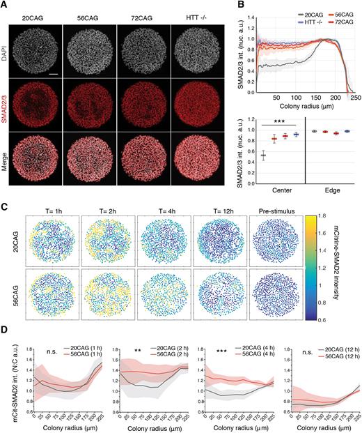 Fig. 4. HTT-CAG expansion and loss of HTT disrupt edge restriction in response to activin signaling. (A) Early nuclear SMAD2/3 (red) accumulation probed by immunofluorescence with antibody recognizing total protein levels in response to activin (100â ng/ml) in conditioned medium. DAPI (gray) was used as a DNA stain. Samples were analyzed 1â h after induction. (B) Mean radial intensity profile of nuclear SMAD2/3 in 20CAG, 56CAG, 72CAG and HTTâ/â. Error bars represent ±s.d. of n=15 colonies obtained from each genotype, all within a similar range of cell density (top). Mean nuclear SMAD2/3 intensity displayed in colony center versus colony edge in each genotype (bottom). ***P<0.001, KruskalâWallis followed by Dunn's test. (C) Temporal analysis of 20CAG and 56CAG mCitrine-SMAD2 reporter colonies before and 1, 2, 4 and 12â h after activin (10â ng/ml) treatment in defined TeSR-E7 medium. Cells were stimulated with activin at T=0â h. Dot plots represent mCitrine-SMAD2 intensity analyzed at a single-cell resolution. (D) Quantification of nuclear-to-cytoplasmic ratio (N:C) of mCitrine-SMAD2 intensities as a function of colony radius in 56CAG (red) compared with 20CAG (gray). Mean response±s.d. is calculated for n=6 (r=250â µm) colonies at 1, 2, 4 and 12â h after treatment with activin. n.s. P>0.05, **P<0.01, ***P<0.001, unpaired t-test. Individual colonies originate from a single micropatterned chip corresponding to each clone. Similar results were obtained from n=3 independent experiments. Scale bar: 100â µm. a.u. arbitrary units. |