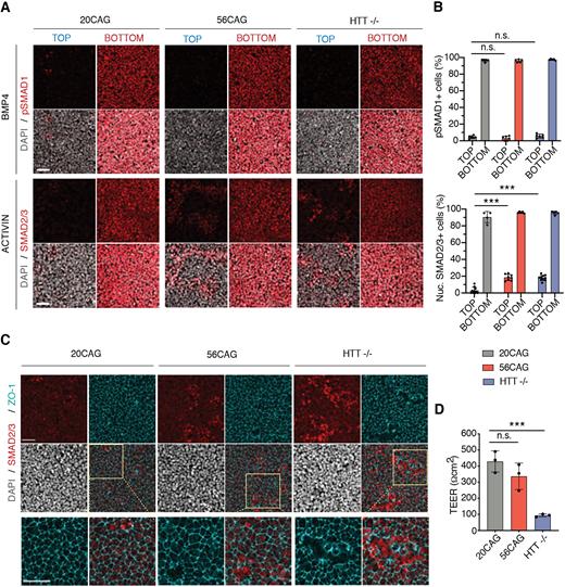 Fig. 5. HTT-CAG expansion disrupts the polarized activin response by affecting receptor relocalization. (A) 20CAG, 56CAG and HTTâ/â hESCs grown on transwell inserts at high density are used to measure the apical versus basal BMP4 (10â ng/ml) response in conditioned medium. Immunofluorescence data for pSMAD1 (red) after ligand delivery to top and bottom compartments (top). Activin (10â ng/ml) induced nuclear SMAD2/3 (red) accumulation in 20CAG, 56CAG and HTTâ/â genotypes in defined TeSR-E6 medium probed by immunofluorescence (bottom). DNA visualized using DAPI (gray). Samples were analyzed 1â h after stimulation. (B) Percentage of pSMAD1+ cells (top) and nuclear SMAD2/3+ cells (bottom) across different HTT genotypes. Samples were analyzed at a single-cell resolution. The fractions of activated cells are presented as mean±s.d. of nâ¥5 images of apically and basally stimulated transwell filters. n.s. P>0.05, ***P<0.001, ANOVA. (C) Tight junction integrity was assessed in high-density hESC cultures on transwell filters by immunostaining against tight junction protein ZO-1 (cyan) at apical SMAD2/3 (red) activation sites in 20CAG, 56CAG and HTTâ/â followed by activin (10â ng/ml) stimulation in defined TeSR-E6 medium. Cell nuclei are visualized using DAPI (gray). Samples were analyzed 1â h after stimulation. (D) TEER was measured to determine epithelial integrity in 20CAG, 56CAG and HTTâ/â. Data are mean±s.d. of n=3 independent measurements. n.s. P>0.05, ***P=0.001, ANOVA. Similar results were obtained from n=3 independent experiments. Scale bars: 50â µm. |