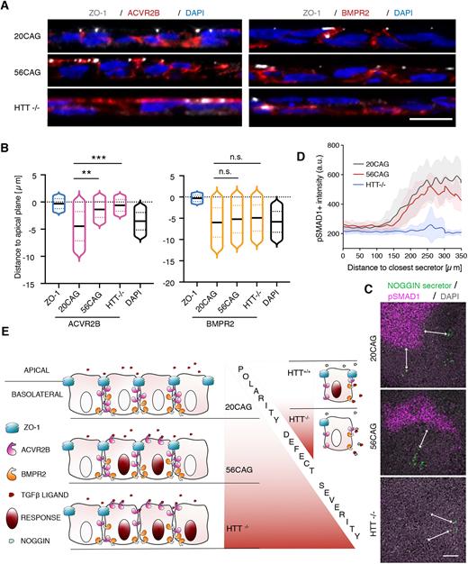 Fig. 7. Ectopic SMAD2/3 signaling is mediated by ACVR2B receptor mislocalization. (A) Immunostaining of ZO-1 (gray) along with transiently expressed ACVR2B-HA (red, left) and BMPR2-HA (red, right) following doxycycline induction in 20CAG, 56CAG and HTTâ/â. DNA is visualized using DAPI (blue). (B) Distance to apical plane defined by ZO-1 and measured for DAPI and ACVR2B (left) or BMPR2 (right) in 20CAG, 56CAG and HTTâ/â. Histograms are represented as violin plots with each of their medians shown in black; dotted lines are 1st and 3rd quartiles. n.s. P>0.05, **P<0.01, ***P<0.001, KruskalâWallis followed by Dunn's test. (C) Immunostaining for pSMAD1 (magenta) and the H2B nuclear marker of doxycycline-induced NOG-expressing cells (green) after BMP4 treatment in 20CAG, 56CAG and HTTâ/â. DAPI (gray) is used for DNA staining. Samples were fixed 16â h post-induction. Double-headed arrows indicate the distance between NOG-expressing and pSMAD1+ cells. (D) pSMAD1 intensity (a.u.) measured proximal to NOG-secreting cells in 20CAG, 56CAG and HTTâ/â. Data are mean±s.d. for nâ¥15 NOG-secreting cells across n=8 images. (E) Schematic of the model by which CAG expansion disrupts polarity selective activin signaling and loss of HTT protein further compromises cellular polarity by impairing epithelial integrity in hESCs. Similar results were obtained from n=2 independent experiments. Scale bars: 10â µm in A; 100â µm in C. a.u.: arbitrary units. |