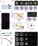 Fig. 1. CAG length-specific reduction of SOX2+ ectodermal lineage in 2D gastruloid differentiation. (A) Generation of isogenic hESC collection using CRISPR/Cas9 genome engineering to model HD. The first exon of HTT was targeted and exchanged for increasing CAG lengths to create an allelic series or was deleted to generate HTTâ/â. Three independent clones were isolated for each genotype. (B) Self-organization of CAG-expanded hESCs in geometrically confined micropatterns induced with BMP4 (50â ng/ml) in conditioned medium for 48â h. Concentric rings of ectodermal SOX2+ (blue), mesodermal BRA+ (red) and extra-embryonic tissue-like CDX2+ (green) domains probed by immunofluorescence (top). Dot plots (bottom) represent relative SOX2 intensity (red, high expression; blue, low expression) normalized to nuclear DAPI. Each dot corresponds to a single cell. (C) Family pictures of 20CAG control (top) and CAG-expanded 56CAG (bottom) 2D gastruloids. Micropatterns were induced with BMP4 and stained for SOX2 (blue) and BRA (red). (D) Analysis of mean SOX2 intensity across colonies with different CAG lengths using immunofluorescence data. Data are mean±s.d. of n>100 colonies for each genotype using n=2 or 3 clones. (E) Quantification of SOX2+ domain presented as area of total 2D gastruloid size (r=250â µm). Each dot corresponds to a single colony, plotted as mean±s.d. of n>100 colonies and n=2 or 3 clones/genotype. ***P<0.001, KruskalâWallis followed by Dunn's test. (F) BMP4-induced self-organization of HTTâ/â and HTT+/+ is visualized by immunostaining against SOX2+ (blue), BRA+ (red) and CDX2+ (green) domains (top). Spatial representation of SOX2 expression analyzed at single-cell resolution (bottom). (G) Analysis of SOX2+ area based on immunofluorescence data and plotted as a percentage of total 2D gastruloid size in HTT+/+ and HTTâ/â. Data are mean±s.d. of n>100 colonies obtained using n=2 or 3 clones for each genotype. n.s. P>0.05, MannâWhitney. (H) Strategy for generating mCitrine-SOX2 reporter lines in 20CAG, 56CAG and 72CAG genetic background using CRISPR/Cas9 technology. Coding region of SOX2 (SOX2 CDS) was labeled with mCitrine fluorescent tag (mCit) and separated from the blasticidin resistance gene (Bsd) by a P2A sequence. (I) BMP4-induced 2D gastruloid differentiation from time-lapse imaging series using mCitrine-SOX2 live reporter cell lines. Images shown before BMP4 addition (T=0â h) and every 10â h after stimulation in 20CAG, 56CAG and 72CAG. (J) Analysis of SOX2 radius as a function of time elapsed in control and HD 2D gastruloids (n=6). Images were acquired every 30â min. Individual colonies originate from a single micropatterned chip for each clone. Similar results were obtained from n=3 independent experiments. Scale bars: 100â µm. |