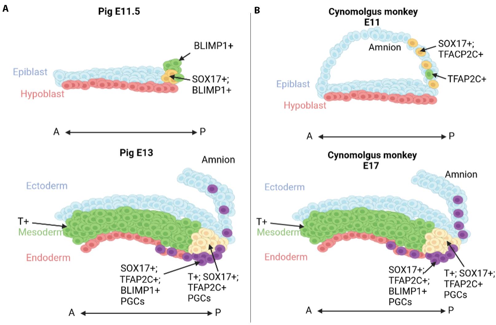 Fig. 1. Specification of PGCs in non-rodent mammals and primates display similarities during gastrulation despite differential PGC markers during earlier development. (A) Porcine embryos form an amnion after implantation, while (B) primate embryos (illustrated by cynomolgus monkey) form an amnion before implantation. SOX17/BLIMP1+ cells are observed in the porcine posterior epiblast prior to gastrulation, while similar cells are observed in the amnion of primates. However, during gastrulation in both species, increased numbers of PGCs are observed in the posterior epiblast. At E13 pig and E17 cynomolgus monkey, yellow cells indicate T+; SOX17+; TFAP2C+ PGCs induced in GLCM, purple cells indicate migratory SOX17+; TFAP2C+; BLIMP1+ PGCs. Image created in Biorender. |