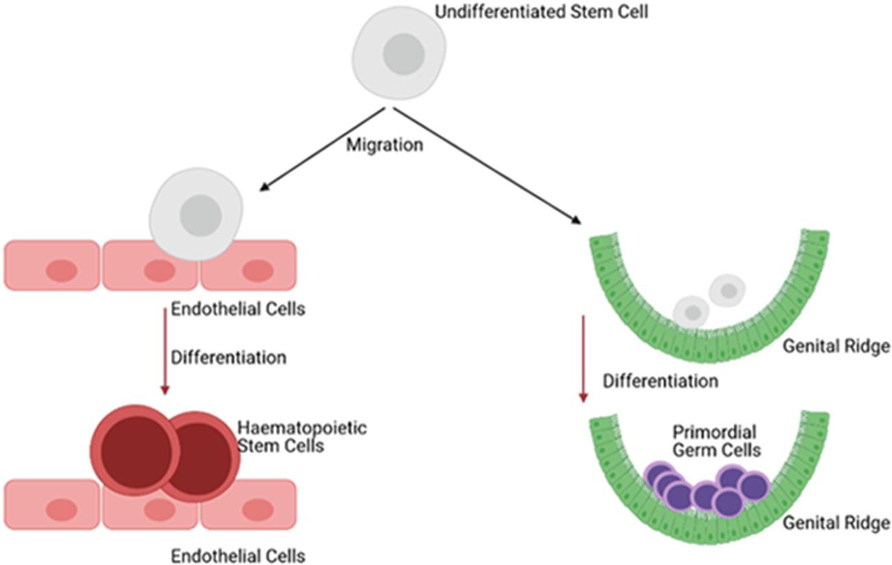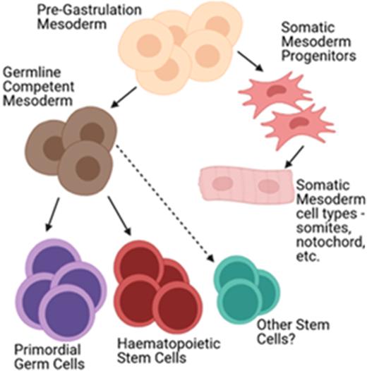 Fig. 2. Potential stem cell differentiation hierarchy in bPGC species. In species which specify PGCs via GLCM, different stem cell types (including HSCs) may also be specified simultaneously and therefore directly share ancestry with PGCs. Image created in Biorender. |