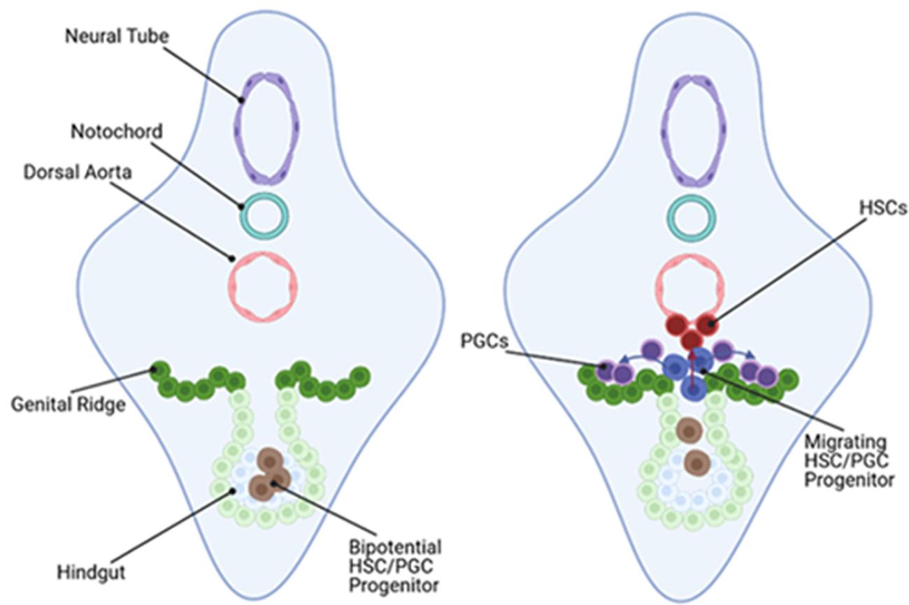 Fig. 3. Predicted basal vertebrate migratory route for PGCs and HSCs. In Carnegie stage 10 (â¼21â days in human embryos) bPGC embryos, pre-migratory bipotential progenitors are associated with the hindgut; Carnegie stage 12 (â¼27â days in human embryos) bPGC embryos display migratory cells expressing both PGC and HSC markers. These cells colonise both the genital ridges and ventral wall of the DA, suggesting they respond stochastically to migratory cues from each tissue. Image created in Biorender. |