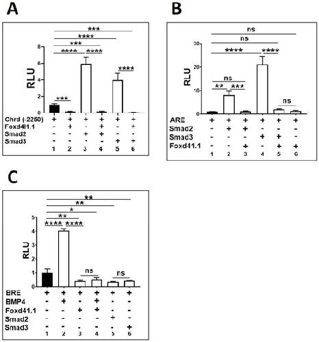 Figure 2. Ectopic presence of Foxd4l1.1 abolished chrd(−2250), ARE, and BRE mediated expression. Xenopus embryos were injected with chrd(−2250), ARE, and BRE (40 pg/embryo) with or without Foxd4l1.1, Smad2/3, or BMP4 mRNA (1 ng/embryo) at the one-cell stage and harvested at stage 11: (A) chrd(−2250) reporter activities with or without Foxd4l1.1 or Smad2/3; (B) ARE reporter activities with or without Foxd4l1.1 or Smad2/3; (C) BRE reporter activities with or without BMP4, Foxd4l1.1, or Smad2/3. The y-axis represents relative light units (RLUs). * p ≤ 0.05, ** p ≤ 0.01, *** p ≤ 0.001, and **** p ≤ 0.0001, n.s. denotes non-significant values.