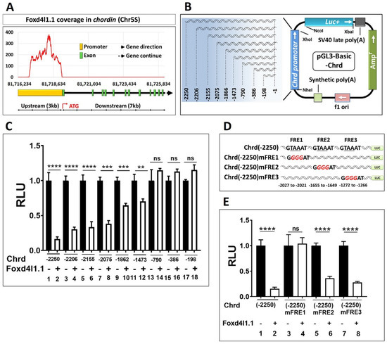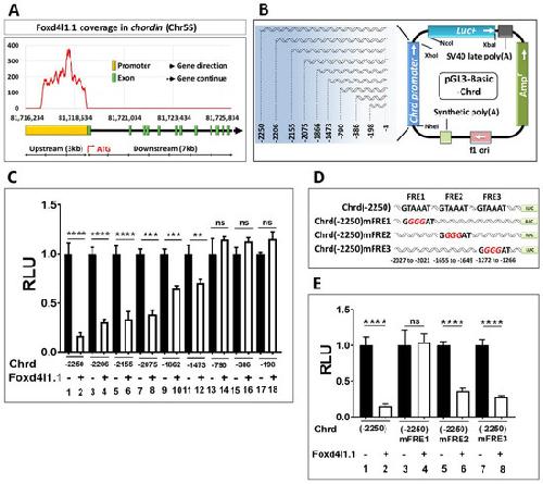 Figure 3. Chrd promoter contains FRE1: (A) ChIP-sequencing coverage plot of Foxd4l1.1 within the chrd promoter region; (B) schematic representation of the serially deleted promoter constructs of chrd promoter. The numbering of promoter constructs (or cis-acting response elements) is given from the translational start site (TLS); (C) relative promoter activities of serially deleted promoter constructs of chrd(-2250) with or without Foxd4l1.1; (D) systemic representation of mutated FRE1, FRE2, and ARE2 (targeted sequences; underlined, italic, red color) within the region of −2250 bps chrd promoter construct; (E) relative luciferase activity for chrd(-2250), chrd(-2250)mFRE1, chrd(-2250)mFRE2, and chrd(-2250)mFRE3 with or without Foxd4l1.1. ** p ≤ 0.01, *** p ≤ 0.001, and **** p ≤ 0.0001, n.s. denotes non-significant values.