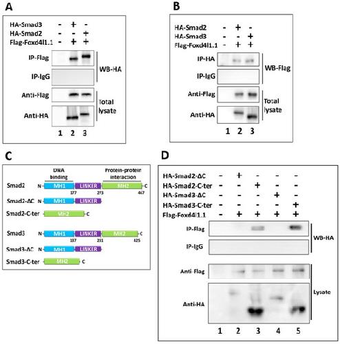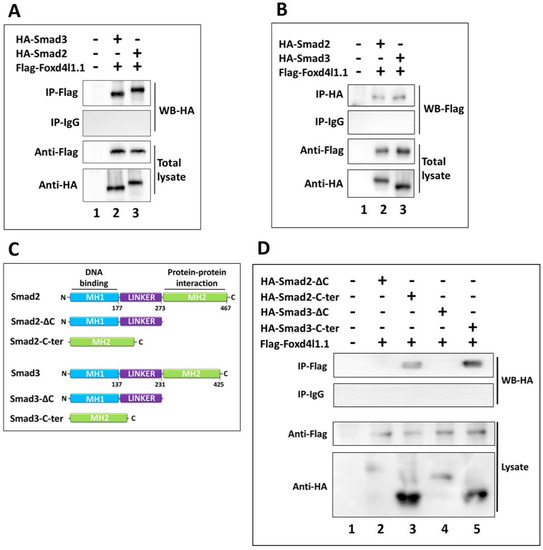 Figure 4. Foxd4l1.1 physically interacts with C-terminal domain of Smad2 and Smad3 proteins: (A,B) co-immunoprecipitation (Co-IP) assay was performed to examine the interaction of Flag-Foxd4l1.1 and HA-Smad2/3 recombinant proteins: (A) Co-IP was performed with an anti-Flag antibody, followed by Western blotting (WB) with anti-HA antibody; (B) Co-IP was performed with anti-HA antibody, followed by WB with anti-Flag antibody; (C) schematic representation of truncated Smad2 and Smad3 constructs; these include Smad2/3-ΔC, having the C-terminal domain deleted, and Smad2/3-C-ter, containing only the C-terminal domain of the original parental protein; (D) co-immunoprecipitation (Co-IP) assay was performed to examine the interaction between Flag-Foxd4l1.1 and HA-Smad2-ΔC, HA-Smad3-ΔC, HA-Smad2-C-ter, and HA-Smad3-C-ter. Co-IP was performed with anti-Flag antibody, followed by WB with anti-HA antibody.