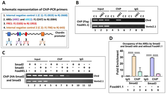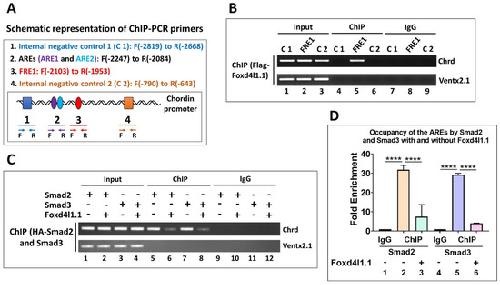 Figure 5. Foxd4l1.1 is bound to FRE1 and blocks Smad2/3 binding to AREs (ARE1 and ARE2). For ChIP-PCR, Flag-Foxd4l1.1 with or without HA-Smad2 and HA-Smad3 mRNA were injected at the one-cell stage, then harvested at stage 11: (A) ChIP-PCR primer design and C 1, ARE1, ARE2, FRE1, and C 2 locations within the chrd promoter are shown with F as location of the forward primer and R as location of the reverse primer; (B) chromatin immunoprecipitation assay was performed to examine the interaction of Flag-Foxd4l1.1 with FRE1, the two internal negative controls (C 1 and C 2), and one external negative control (Ventx2.1); (C) chromatin immunoprecipitation assay was performed to examine the occupancy of either Smad2 or Smad3 with or without Foxd4l1.1. Ventx2.1 served as external negative control; (D), ChIP-qPCR was performed to examine the occupancy of HA-Smad2 and HA-Smad3 to AREs with or without Flag-Foxd4l1.1 (fold enrichment method used to normalize the ChIP-qPCR reads). **** p ≤ 0.0001.