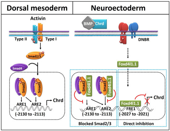 Inhibition of the bone morphogenetic proteins (BMPs) is the primary step toward neuroectoderm formation in vertebrates. In this process, the Spemann organizer of the dorsal mesoderm plays a decisive role by secreting several extracellular BMP inhibitors such as Chordin (Chrd). Chrd physically interacts with BMP proteins and inhibits BMP signaling, which triggers the expression of neural-specific transcription factors (TFs), including Foxd4l1.1. Thus, Chrd induces in a BMP-inhibited manner and promotes neuroectoderm formation. However, the regulatory feedback mechanism of Foxd4l1.1 on mesodermal genes expression during germ-layer specification has not been fully elucidated. In this study, we investigated the regulatory mechanism of Foxd4l1.1 on chrd (a mesodermal gene). We demonstrate that Foxd4l1.1 inhibits chrd expression during neuroectoderm formation in two ways: First, Foxd4l1.1 directly binds to FRE (Foxd4l1.1 response elements) within the chrd promoter region to inhibit transcription. Second, Foxd4l1.1 physically interacts with Smad2 and Smad3, and this interaction blocks Smad2 and Smad3 binding to activin response elements (AREs) within the chrd promoter. Site-directed mutagenesis of FRE within the chrd(-2250) promoter completely abolished repressor activity of the Foxd4l1.1. RT-PCR and reporter gene assay results indicate that Foxd4l1.1 strongly inhibits mesoderm- and ectoderm-specific marker genes to maintain neural fate. Altogether, these results suggest that Foxd4l1.1 negatively regulates chrd transcription by dual mechanism. Thus, our study demonstrates the existence of precise reciprocal regulation of chrd transcription during neuroectoderm and mesoderm germ-layer specification in Xenopus embryos.