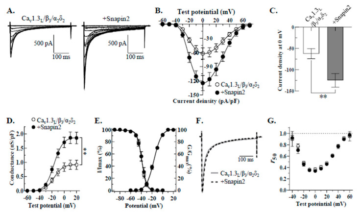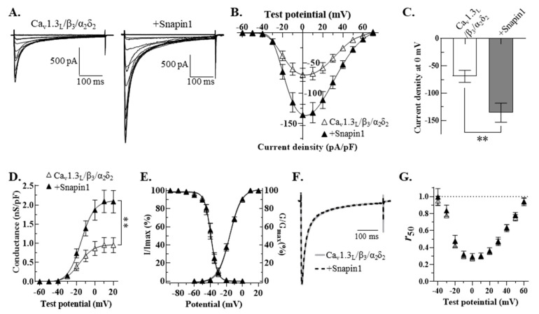 Figure 6. Up-regulation effect of Snapin1 variant on Cav1.3L channels. (A) Cav1.3L/β3/α2δ2 without (left) or with (right) Snapin1 were co-expressed in HEK-293 cells. The same voltage protocols and analysis described in Figure 2 were used to characterize the biophysical properties of Cav1.3L channels. (B) The I-V relationships of Cav1.3L/β3/α2δ2 co-expressed with (▲) or without (∆) Snapin1 (n = 8). (C) Snapin1 effect on the maximal current density of Cav1.3L. The maximal current density values of Cav1.3L without or with Snapin1 are −69.2 ± 11.0 pA/pF and −135.7 ± 17.6 pA/pF (n = 10; Student’s unpaired t-test, p < 0.01, **). (D) The chord conductance of Cav1.3L channels without (∆) or with (▲) Snapin1. The maximal normalized conductance values of Cav1.3L without or with Snapin1 are 0.95 ± 0.20 and 2.09 ± 0.29 nS/pF (n = 10; Student’s unpaired t-test, p < 0.01, **). (E) Channel availability and activation curves of Cav1.3L channels without (∆) or with (▲) Snapin1 (n = 10). (F,G) No alteration in the CDI of Cav1.3L by Snapin1. Ca2+ current traces through Cav1.3L channels without or with Snapin1 evoked at 0 mV test potential were superimposed. The r50 values (G) of Cav1.3L channels in the presence or absence of Snapin1 at various test potentials did not change the CDI of Cav1.3L channels (n = 7).