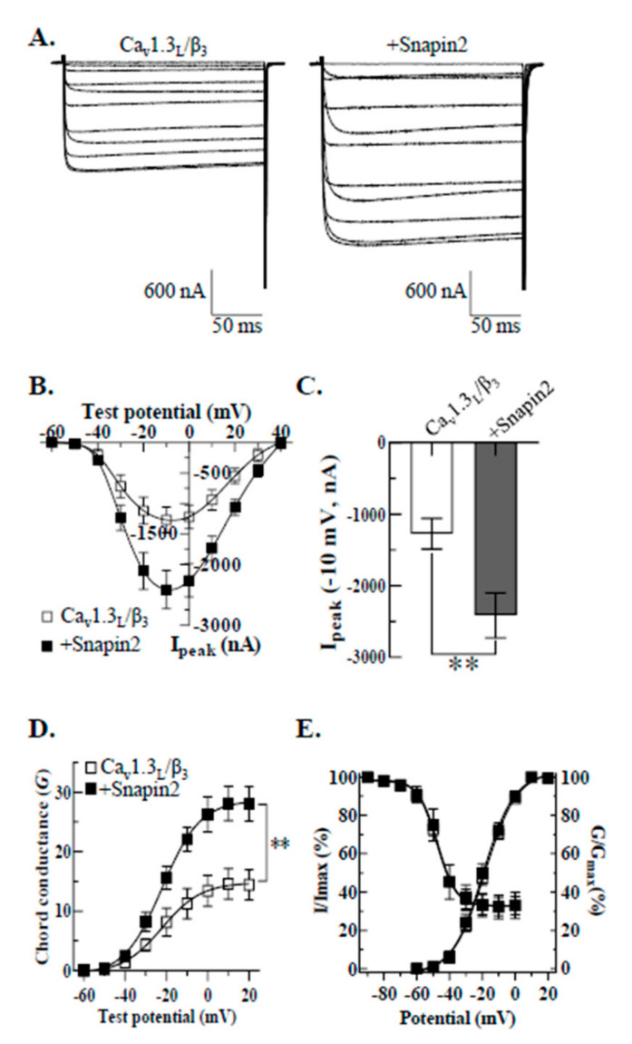 Figure 3. Snapin2 co-expression up-regulated Cav1.3L channel activity in Xenopus oocytes. (A) Representative current traces of Cav1.3L and Cavβ3 co-expressed without (left) or with Snapin2 (right) recorded in 10 mM Ba2+ solution. Current traces were evoked by an I-V protocol consisting of 200-ms depolarizing step pulses from −60 mV to +40 mV from a holding potential of −80 mV. (B,C), I-V relationships of Cav1.3L channels without or with Snapin2. (B) Average peak current amplitude values of Cav1.3L without (□) or with Snapin2 (■) were plotted against test potentials (n = 20–23). (C) The average peak current amplitude values of Cav1.3L channels at −10 mV test potential are represented as bar graphs (−1271.1 ± 214.1 vs. −2414.5 ± 314.6 nA; n = 20–23; Student’s unpaired t-test, p < 0.01, **). (D) Chord conductance of Cav1.3L channels co-expressed without (□) or with Snapin2 (■). Snapin2 co-expression enhanced about 1.9-fold the maximum chord conductance values (14.6 ± 2.6 vs. 28.1 ± 2.9 nS; n = 20; Student’s unpaired t-test, p < 0.01, **). (E) Snapin2 effect on voltage-dependent channel activation and channel availability of Cav1.3L channels. The chord conductance values of Cav1.3L channels without (□) or with Snapin2 (■) were normalized to the maximal chord conductance and superimposed. A similar two-step pulse protocol was applied to evaluate channel availability of Cav1.3L channels without (□) or with Snapin2 (■). Normalized data for channel availability were plotted against pre-pulse potentials, and the smooth curves were from fitting the data to the Boltzmann equation (n = 20 for activation, n = 17 for channel availability).