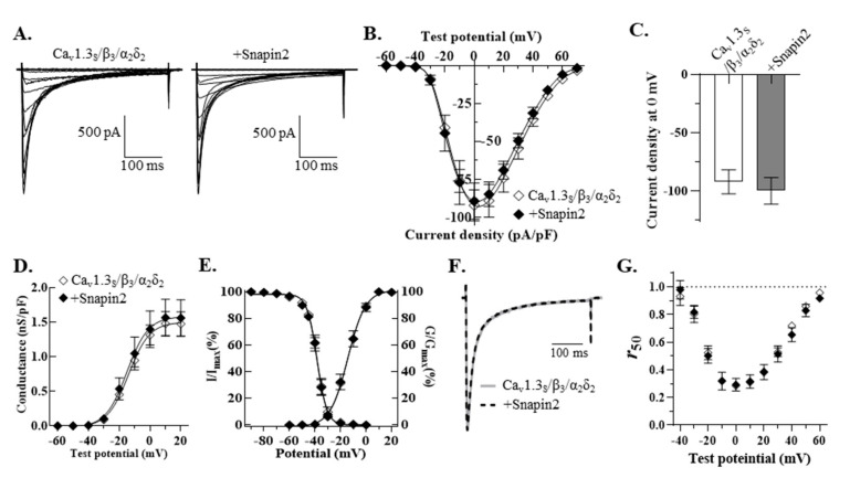 Figure 4. No regulatory effect of Snapin2 on Cav1.3S. (A) Representative current traces through Cav1.3S/β3/α2δ2 co-expressed without (left) or with Snapin2 (right). Cav1.3S current traces were evoked in response to the I-V protocol (described in Figure 2) in 10 mM Ca2+ solution. (B,C) I-V relationships of Cav1.3S channels without (◇) or with Snapin2 (◆). Average current density values (pA/pF) were plotted against test potentials (n = 8). (C) The average peak current density values at 0 mV test potential are represented as bar graphs (−92.1 ± 10.2 vs. −89.3 ± 11.9 pA/pF; n = 8). (D) No effect of Snapin2 on the chord conductance of Cav1.3S channels. The chord conductance values were normalized to the cell capacitance and plotted against test potentials (1.5 ± 0.2 vs. 1.6 ± 0.3 nS/pF; n = 8). (E) Activation and channel availability curves of Cav1.3S channels co-expressed without or with Snapin2. Activation and channel availability curves of Cav1.3S channels were obtained by the same methods in Figure 2 legend (n = 8). (F) Snapin2 effect on the CDI of Cav1.3S channels. Cav1.3S Ca2+ current traces elicited at 0 mV test potential were superimposed, exhibiting no difference in CDI. (G) No alteration in the r50 value of Cav1.3S. The r50 values of Cav1.3S channels (±Snapin2) were plotted against test potentials (n = 5). No differences in the r350 values were detected (data not shown).