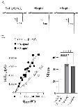 Figure 8. Increment of opening probability of Cav1.3L channels by Snapin. (A) Representative gating current and tail current of Cav1.3L/β3/α2δ2 co-expressed without or with Snapin 1 or 2. ON-gating currents were measured upon depolarizing to the virtual reversal potential from a holding potential of −80 mV and tail currents were measured upon repolarizing to −80 mV holding potential from the same cells. (B) Correlation of ON-gating currents and tail currents. QON (fC) values were plotted against tail current amplitudes (left panel, n = 8–10). The slope values obtained from linear regression of data are −24.2 ± 1.0 for Cav1.3L/β3/α2δ2, −48.7 ± 2.7 for Cav1.3L/β3/α2δ2 plus Snapin2, and −45.5 ± 2.2 for Cav1.3L/β3/α2δ2 plus Snapin1 and are represented as bar graphs. Statistical significances were tested with one-way ANOVA with Tukey’s multiple comparison (p < 0.0001, ****).