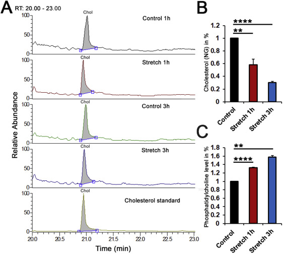 Figure 1The C/P ratio in TM membranes is stretch-dependent. (A) Representative chromatograms and (B) Normalized and averaged cholesterol GS/MS data in control, 1 h and 3 hours stretched primary TM cells; (C) Normalized and averaged phosphatidylcholine (PC) fluorometric data in control, 1 h and 3 hour stretched primary TM cells. Stretch induced a time-dependent decrease in membrane cholesterol level, which was concomitant with increasing content of membrane P.C. N = 3; **, P < 0.01; ****, P < 0.0001.