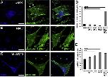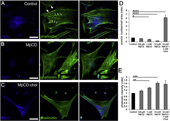 Figure 2Cholesterol depletion promotes formation of actin stress fibers. Double-labeling for F-actin (phalloidin-Alexa 488 nm) and filipin (405 nm). (A) Untreated preparations show typical stress fiber organization dotted by lipid rafts. (B) 1-hour incubation with MβCD results in dissolution of filipin+ puncta and upregulation of phalloidin-actin fluorescence. (C) Saturated 1:10 admixture of cholesterol (1 mM) and MβCD (10 mM) increased the number of filipin puncta. (D-E) Averaged data for experiments shown in A-C (N = 3-4). *, P < 0.05, **; P < 0.01, ***, p < 0.001 and ****, p < 0.0001. Scale bar = 20 μm.