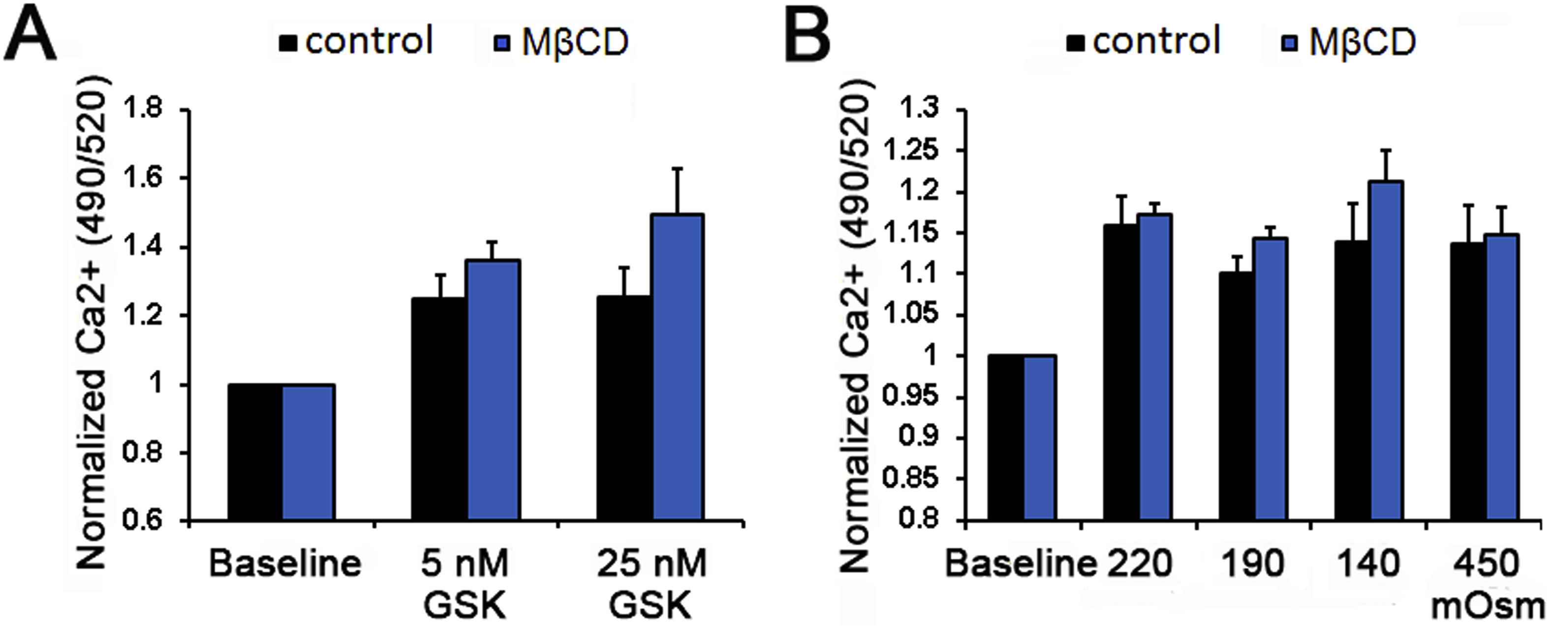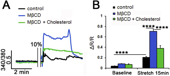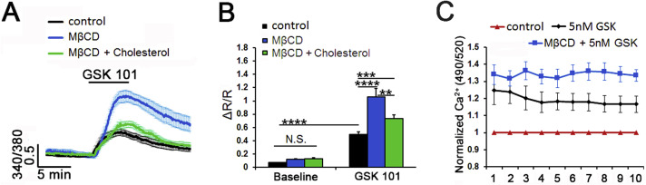 Figure 3Cholesterol depletion increases the amplitude of TRPV4 agonist-induced Ca2+ signals. (A-B) Ratiometric signals in Fura-2 AM-loaded cells. (A) GSK101-induced elevations are increased in MβCD -treated cells (n = 8-10) (B) Averaged data. MβCD (blue bar) augmented, whereas MβCD:cholesterol (green bar) reduced the amplitude of agonist-induced fluorescence. (C) Fluorimetry, cell populations in 96 wells. 5 nM GSK101 increased Fluo-4 fluorescence. Its effect was facilitated (⼠12%) by MβCD (N = 4). **, P < 0.01; ***, P < 0.001; ****, P < 0.0001; N.S., non-significant.