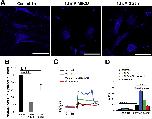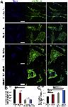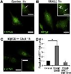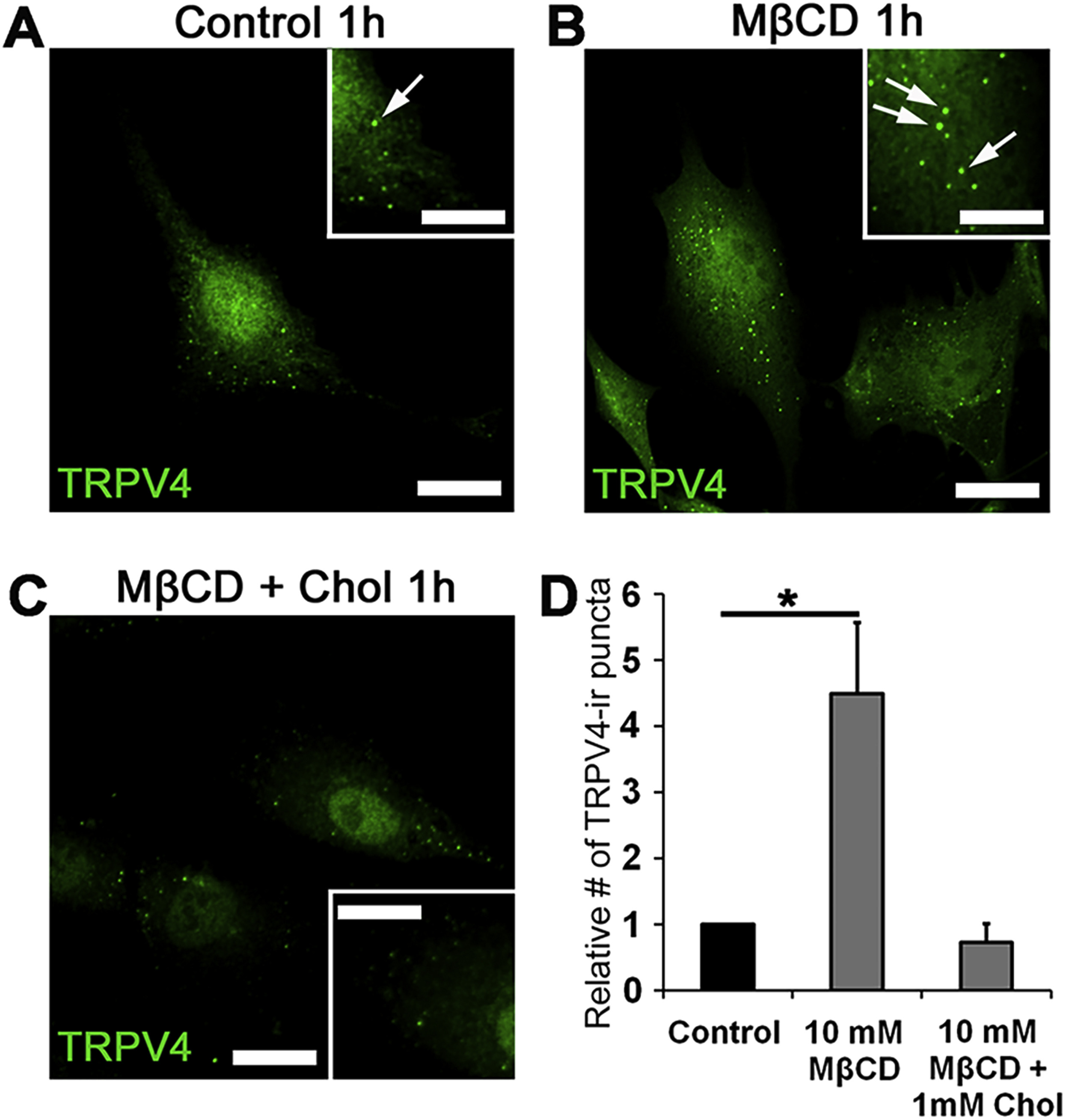 Figure 7Cholesterol depletion increases the number of TRPV4-ir puncta. TRPV4 immunolabeling of primary TM cells. Representative examples of (A) Control, (B) 1-hour treatment with MÃCD and (C) 1-hour treatment with MβCD:cholesterol. Inset: zoomed-in region with TRPV4-ir puncta (arrow); (D) Summary of 3 independent experiments, normalized for control cells. The number of TRPV4 puncta is upregulated after incubation with MÃCD. *, P < 0.05. Scale bar: 10 μm.