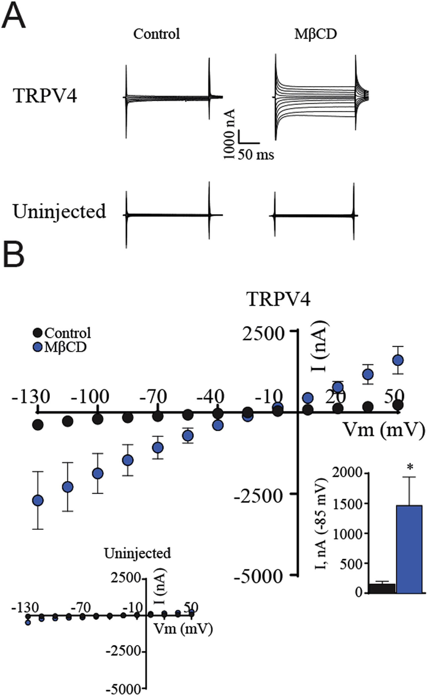 Figure 8Cholesterol depletion enhances TRPV4-mediated membrane currents in Xenopus oocytes (A) Representative current traces from TRPV4-expressing oocytes and uninjected control oocytes in control solution or after 45 min exposure to 50 μM MβCD. (B) I/V curves of TRPV4-expressing oocytes exposed to control solution or MβCD, with uninjected oocytes in inset. Summarized currents obtained at -85 mV shown in the lower inset. The magnitude of TRPV4-mediated currents (at Vm = -85 mV) were compared using Studentâs t-test. **, P < 0.01; NS: not significant. N = 9.