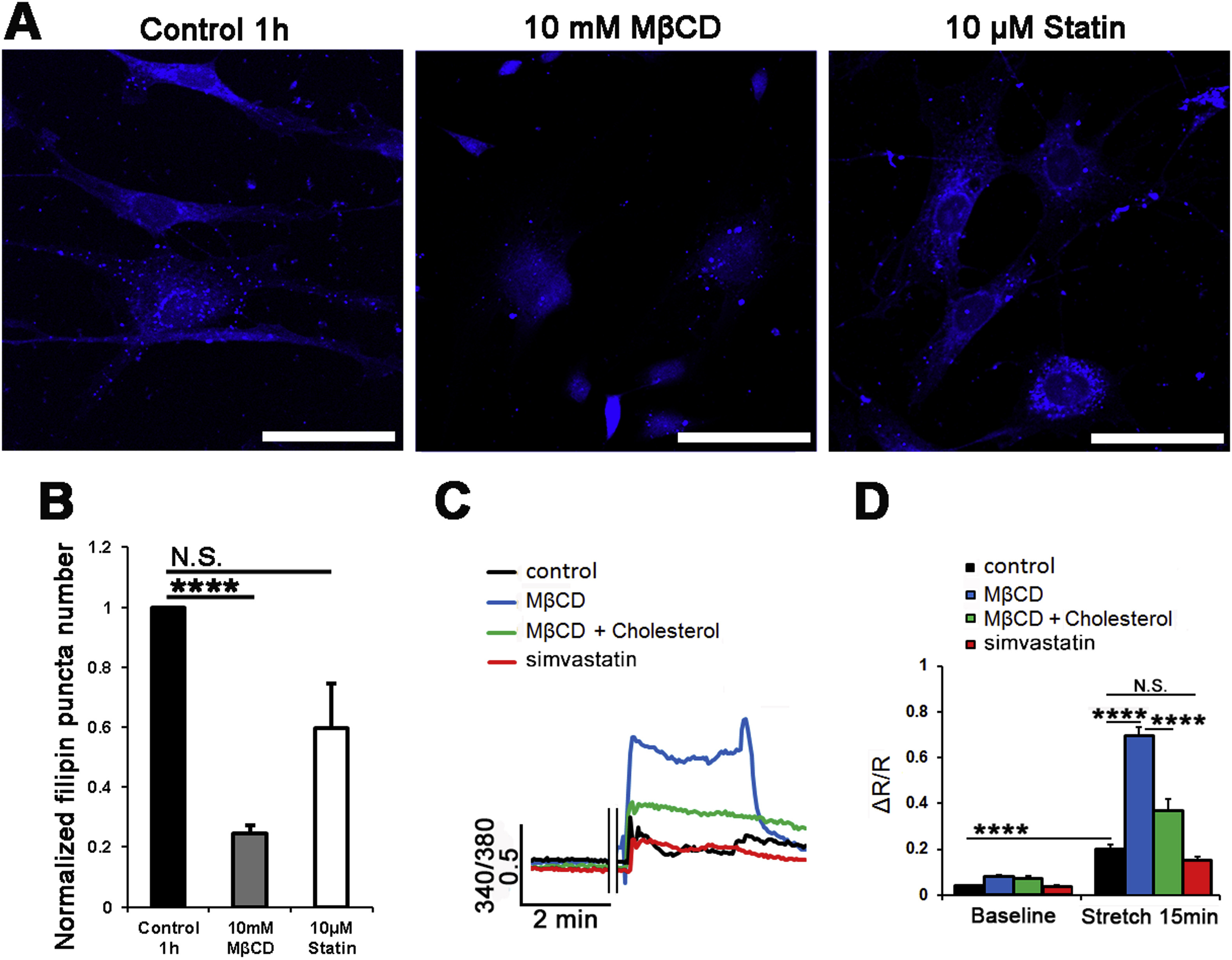 Figure 6Membrane cholesterol content regulates stretch-dependence of cytoskeletal remodeling. (A) TM cells were stretched in the presence/absence of MßCD and MßCD:cholesterol, and labeled for filipin (405 nm) and phalloidin-Alexa 488 nm in control, 6% stretch (0.5 Hz, 6%, 1 hour), MßCD and MßCD + stretch samples. (B) Averaged and normalized puncta number. Filipin is significantly reduced by stretch and MßCD alone. (C) Stretch and MßCD significantly facilitate F-actin fluorescence. Combined stimulation results in an additional ∼30% increase in stress fiber signal. (N = 3-4) *, P < 0.05; **, P < 0.01; ***, P < 0.001; ****, P < 0.0001. Scale bar: 20 μm.