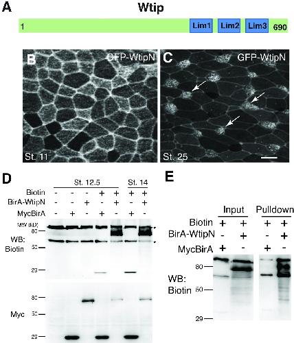 A, Schematic of Wtip. B, C, Embryos were injected with 200 pg of GFP-WtipN RNA, fixed and imaged at the indicated stages. B, GFP-WtipN junctional staining in stage 11 ectoderm. C, GFP-WtipN is localized to basal bodies of skin multiciliated cells (arrows, stage 25). Scale bar, 20 μm. D, Biotinylation of the BirA-WtipN fusion. Four-cell embryos were injected with myc-BirA RNA (300 pg) or mycBirA-WtipN RNA (700 pg) with or without 0.8 mM biotin. Self-biotinylation of mycBirA and mycBirA-WtipN is revealed only in the presence of biotin. Protein levels were assessed with anti-myc antibody. Asterisks indicate endogenous avidin-binding proteins. E. Biotinylated proteins were pulled down with neutravidin beads. In addition to self-biotinylated mycBirA-Wtip, multiple biotinylated bands are detected in the lysates as well as in pulldown.