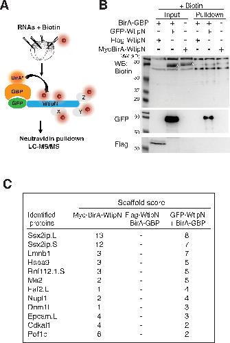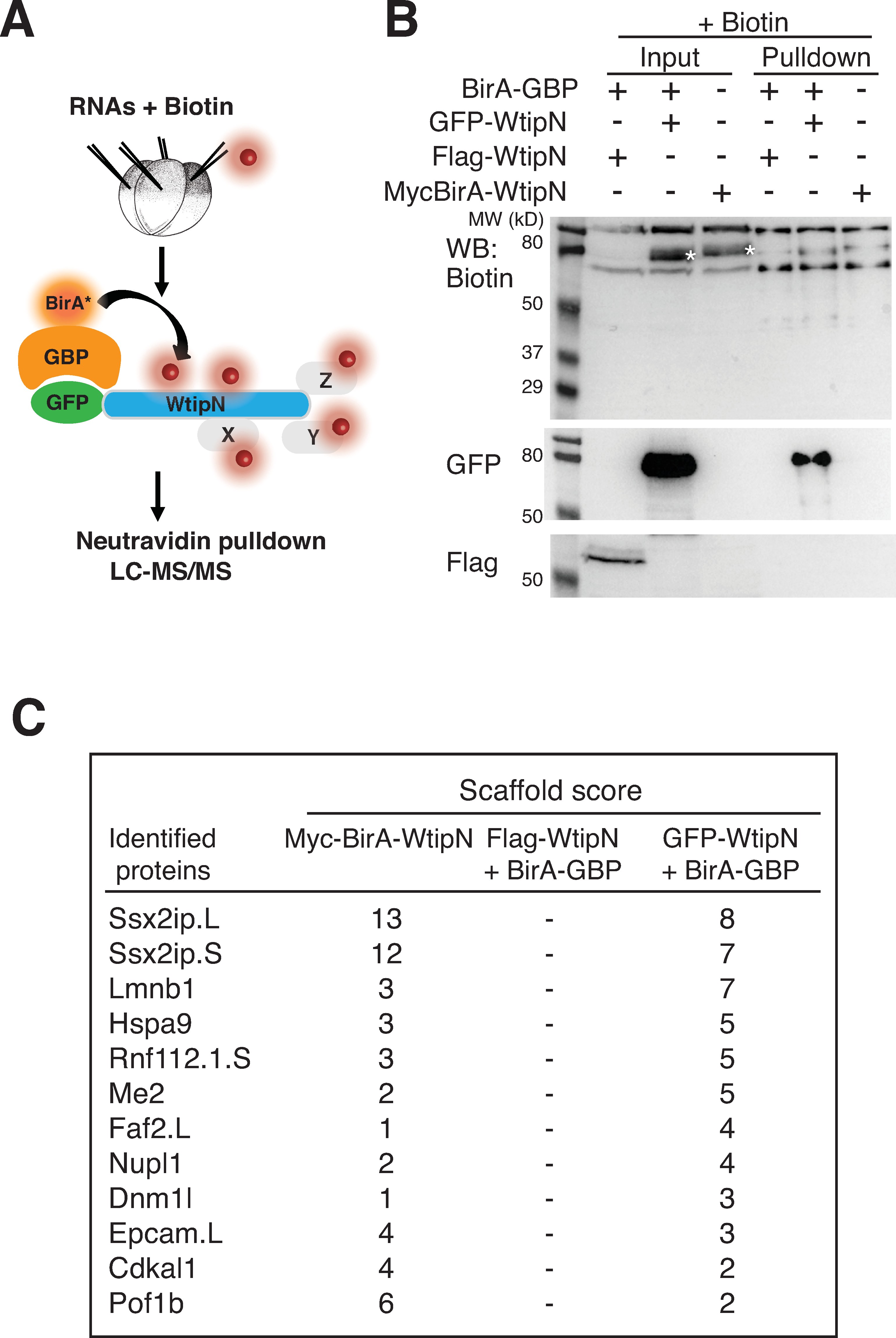 A, Scheme of targeted proximity biotinylation (TPB) with GFP-WtipN. Early embryos were injected with indicated RNAs (200 pg each) and biotin (1.2 mM). B, Biotinylated proteins were enriched with neutravidin agarose beads and immunoblotted with indicated antibodies. Biotinylated GFP-WtipN (asterisk) but not Flag-WtipN in the presence of BirA-GBP was detected in the pulldown. MycBirA-WtipN (asterisk) was biotinylated in the absence of BirA-GBP. C, Top hits identified by SCAFFOLD after LC-MS/MS analysis in both experimental groups but not in the negative control group.