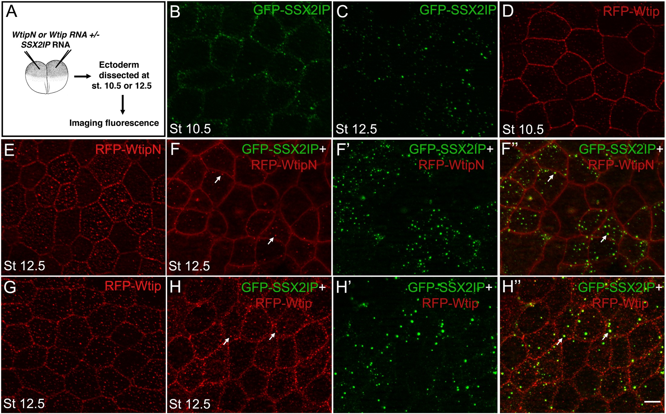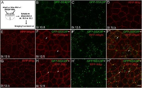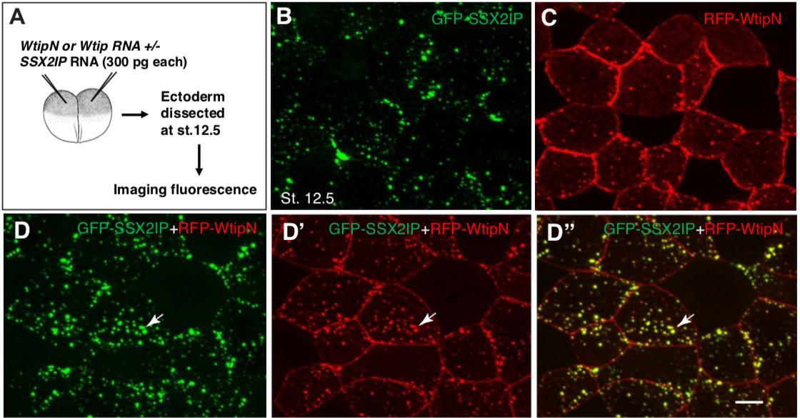 S1Fig. Colocalization of SSX2IP andWtipNin ectoderm cells.A, Experimental scheme.RFP-WtipNRNA (300 pg) andGFP-XSSX2IPRNA (300 pg)were coinjectedinto four-cell embryos. When the embryos reached stage 12.5, they were fixed, and the ectodermal tissue was imaged. B, GFP-SSX2IP localization in ectoderm cells. SSX2IPcolocalizes with WtipN in cytoplasmic puncta. C, RFPWtipN localization at the junctions and cytoplasmic puncta. D-Dââ, Coexpression of both proteins revealed mixed cytoplasmic aggregates (arrow). Scale bar, 15 μm. Data are representative of 3 independent experiments.